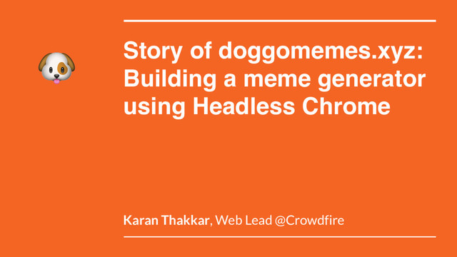 Chrome recently launched cross platform support for Headless mode from Chrome 59 onwards. There has already been a lot of buzz regarding the variety of use cases that can be achieved with it like automated testing, screenshot/pdf generation, access to all of devtools features using the devtools protocol including audits, performance, coverage, etc. Having previously built an image generation service using phantomjs, I wanted to see how complex it was to do something similar using headless chrome. The talk involves building a minimal meme generator using: React(for meme preview), Node & Hapi(for API server) and Headless Chrome (for image generation)