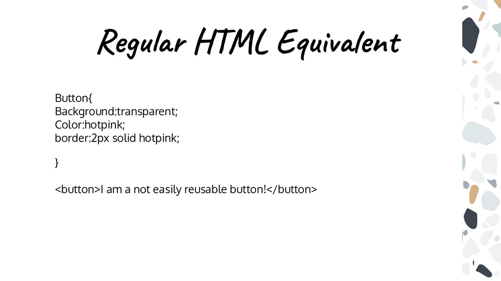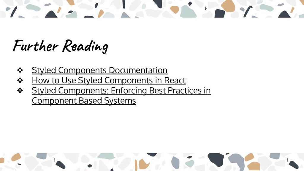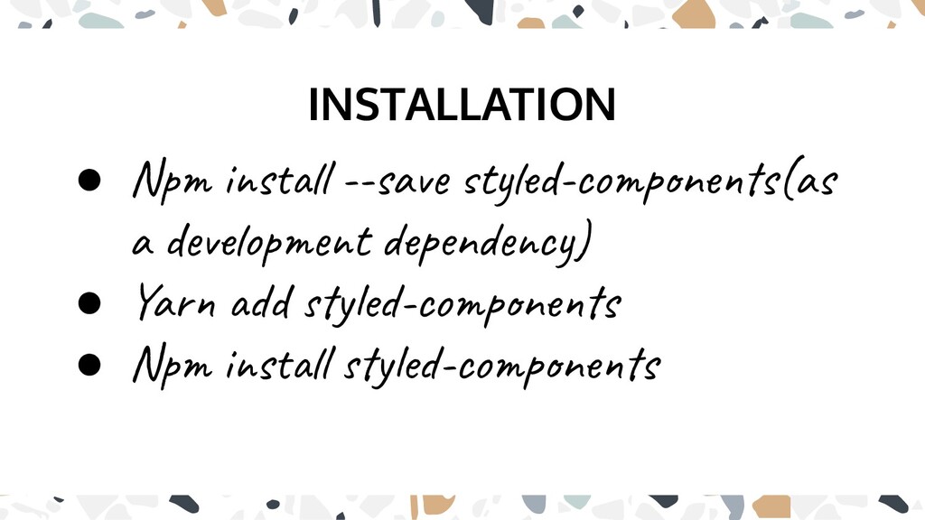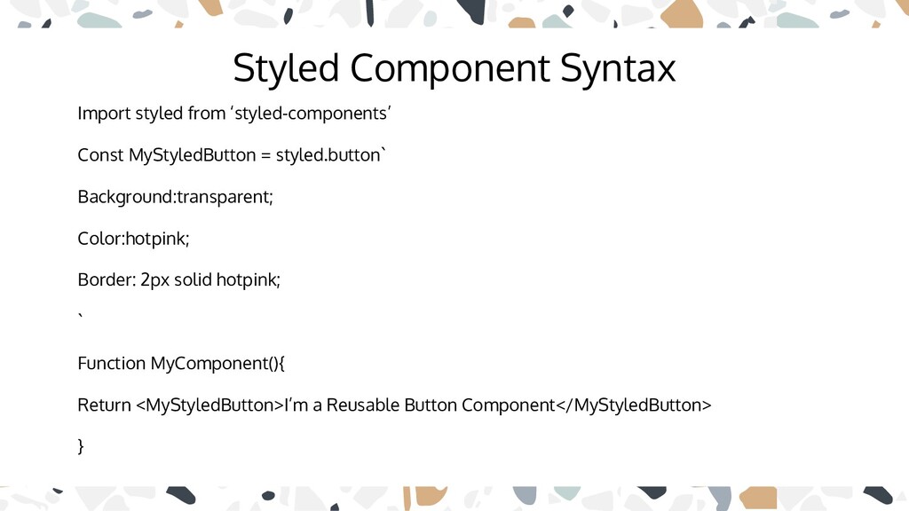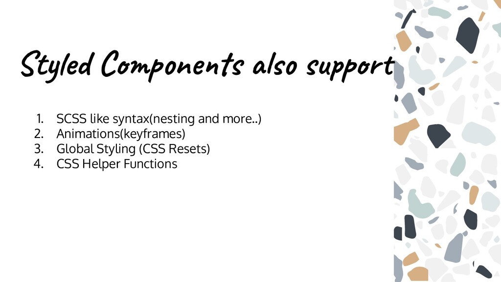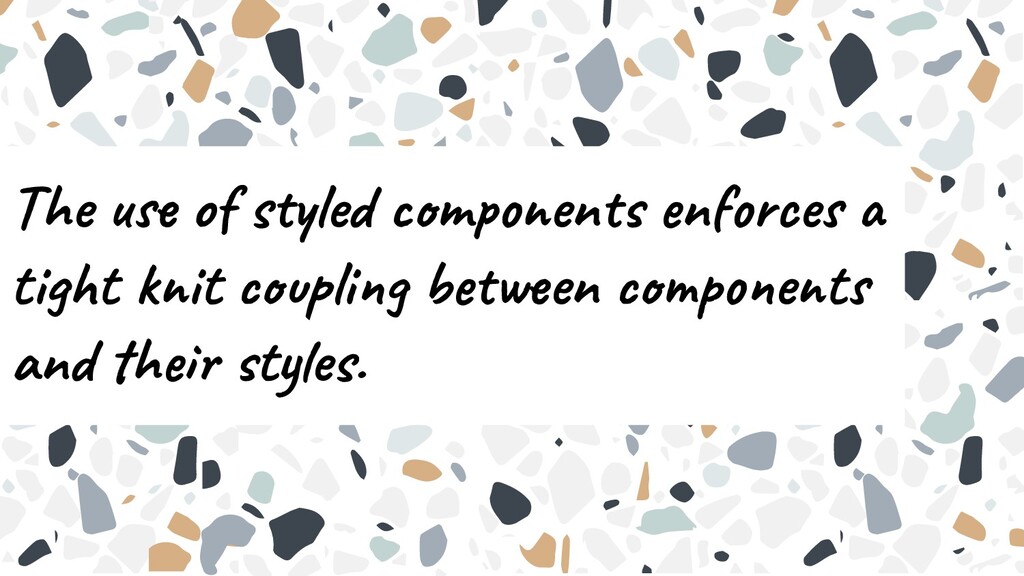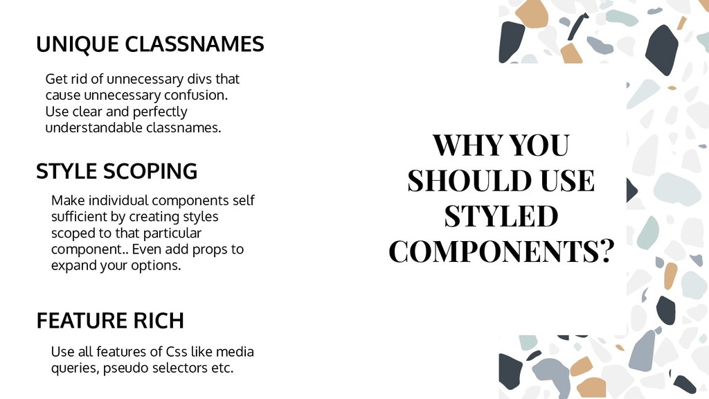 confusion. Use clear and perfectly understandable classnames. Make individual components self sufficient by creating styles scoped to that particular component.. Even add props to expand your options. FEATURE RICH Use all features of Css like media queries, pseudo selectors etc. WHY YOU SHOULD USE STYLED COMPONENTS? STYLE SCOPING