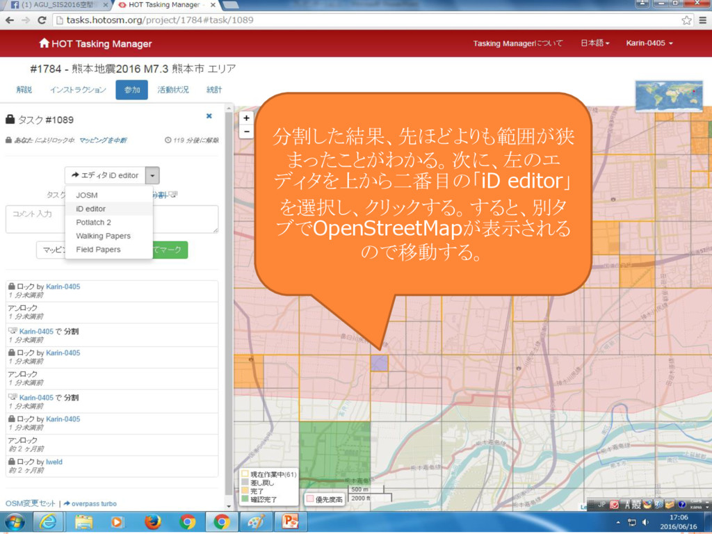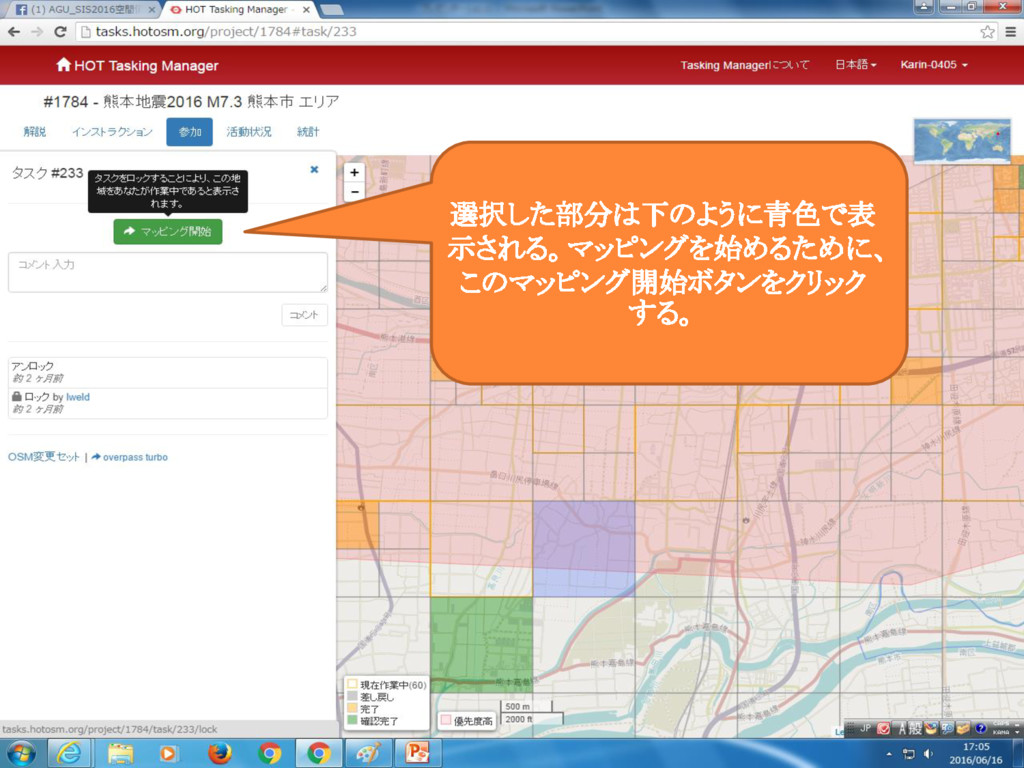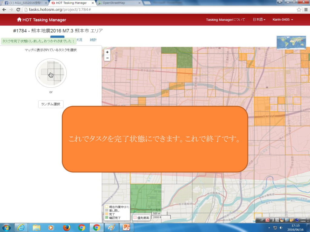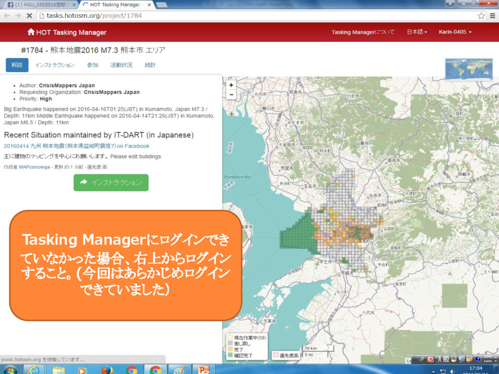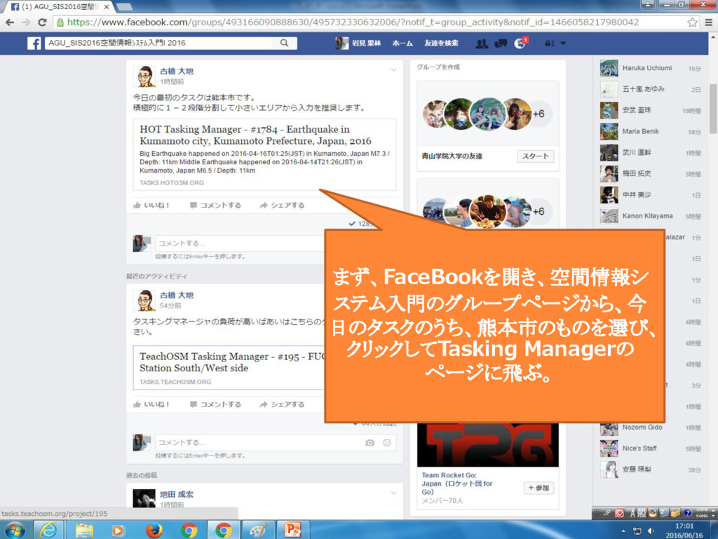 まず、FaceBookを開き、空間情報シ ステム入門のグループページから、今 日のタスクのうち、熊本市のものを選び、 クリックしてTasking Managerの ページに飛ぶ。