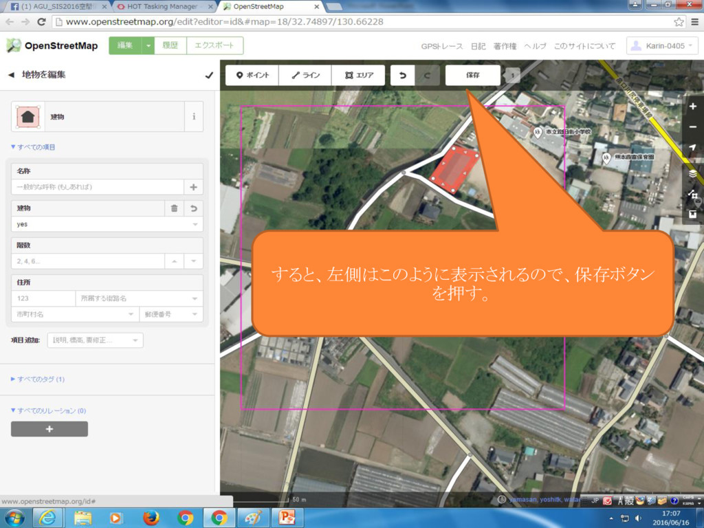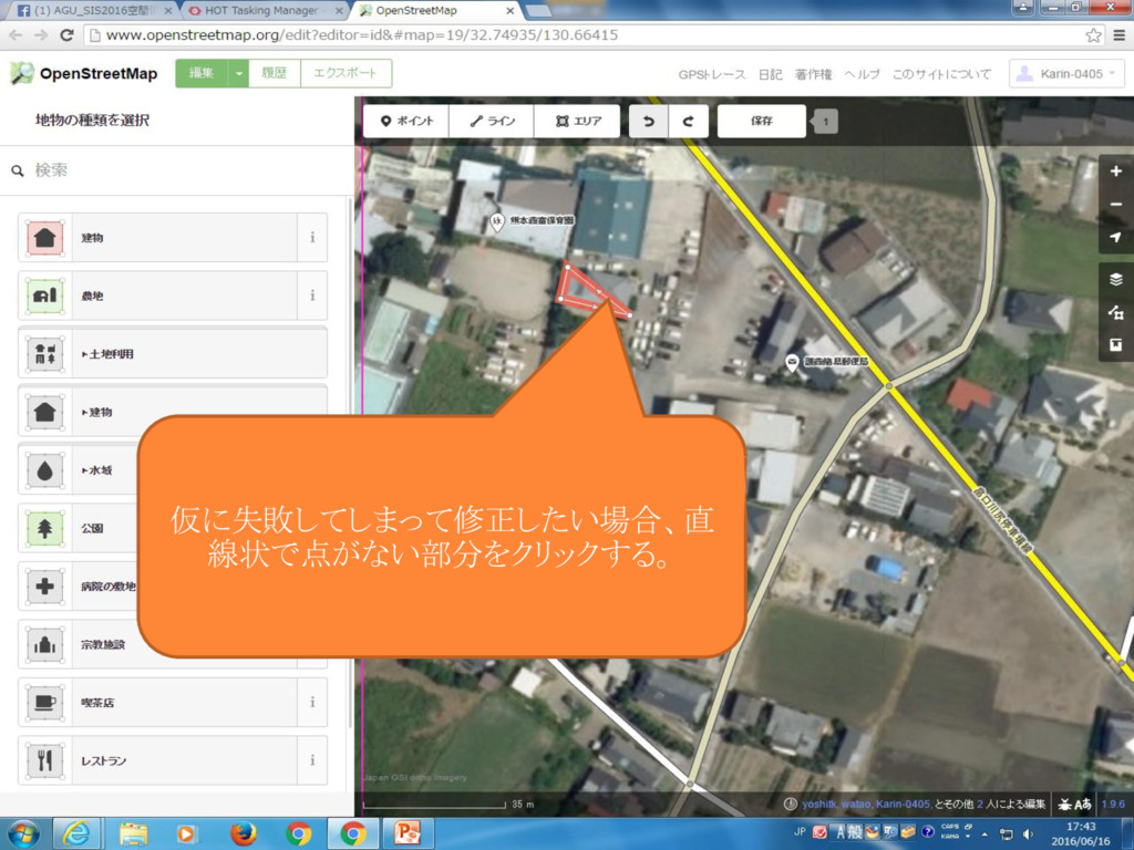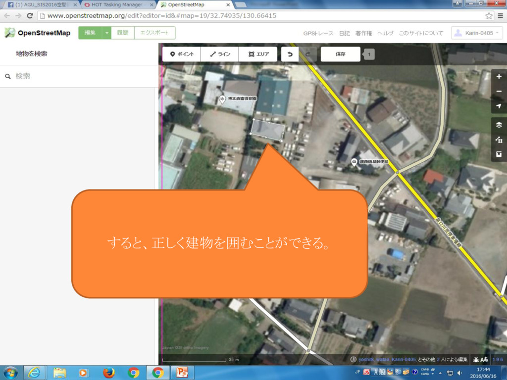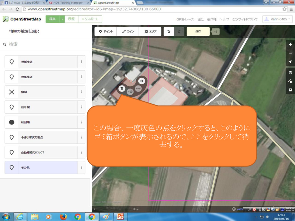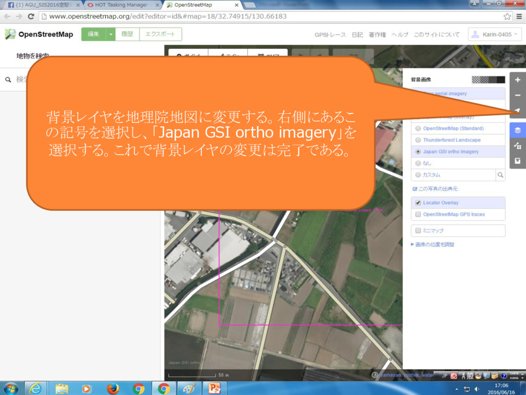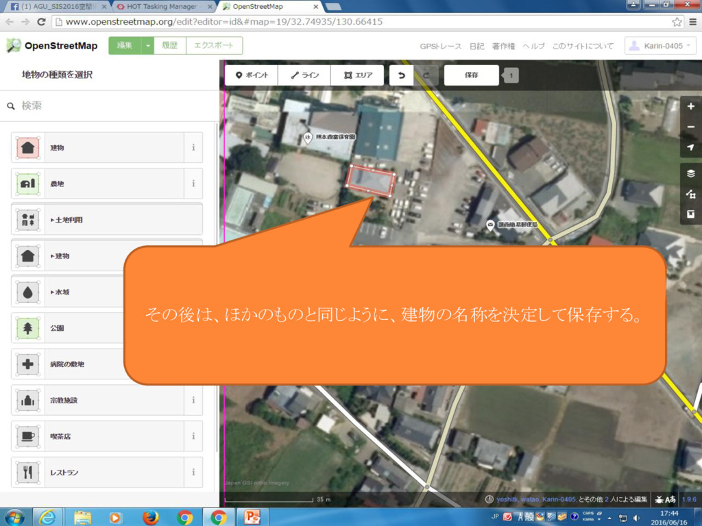 まず、FaceBookを開き、空間情報シ ステム入門のグループページから、今 日のタスクのうち、熊本市のものを選び、 クリックしてTasking Managerの ページに飛ぶ。
