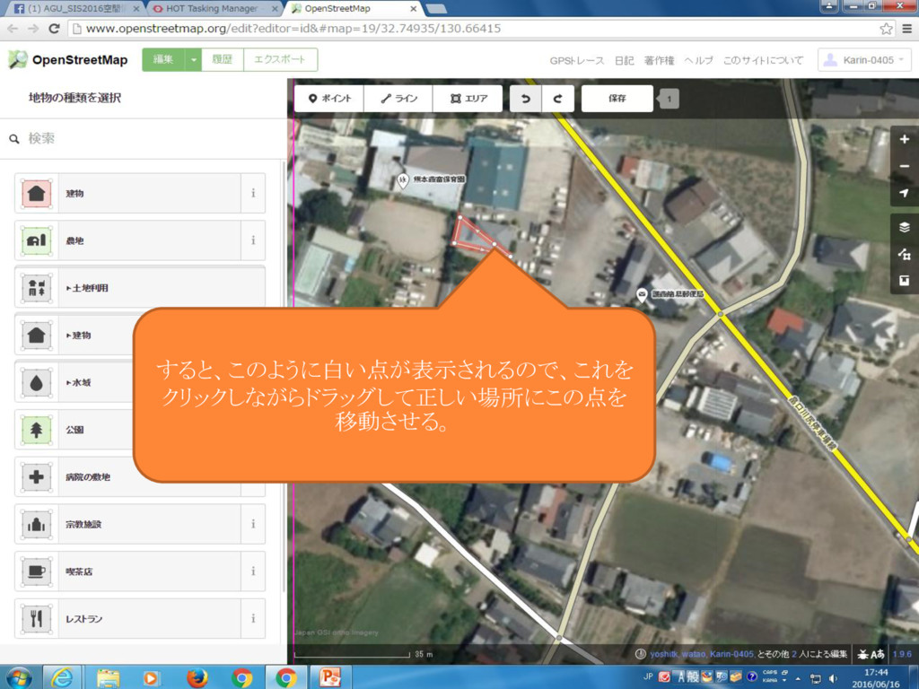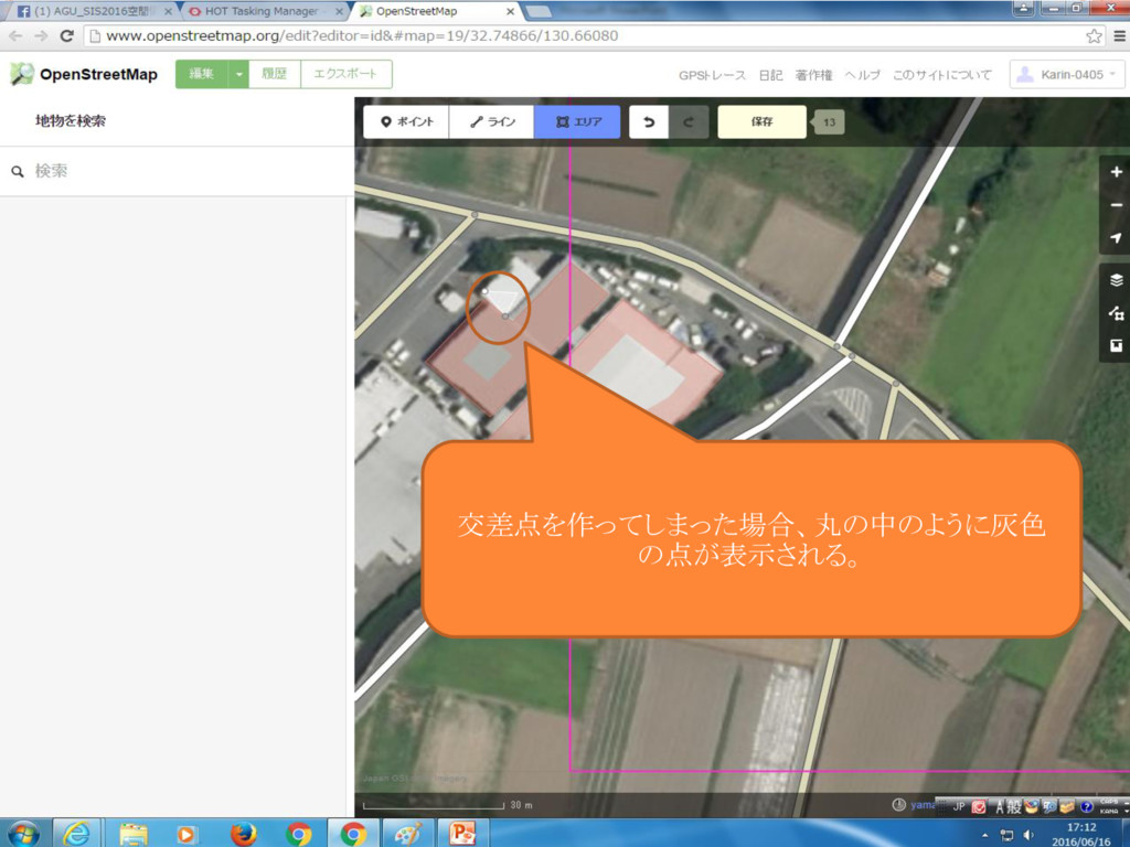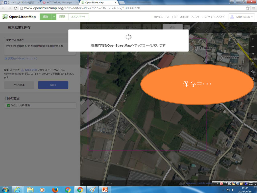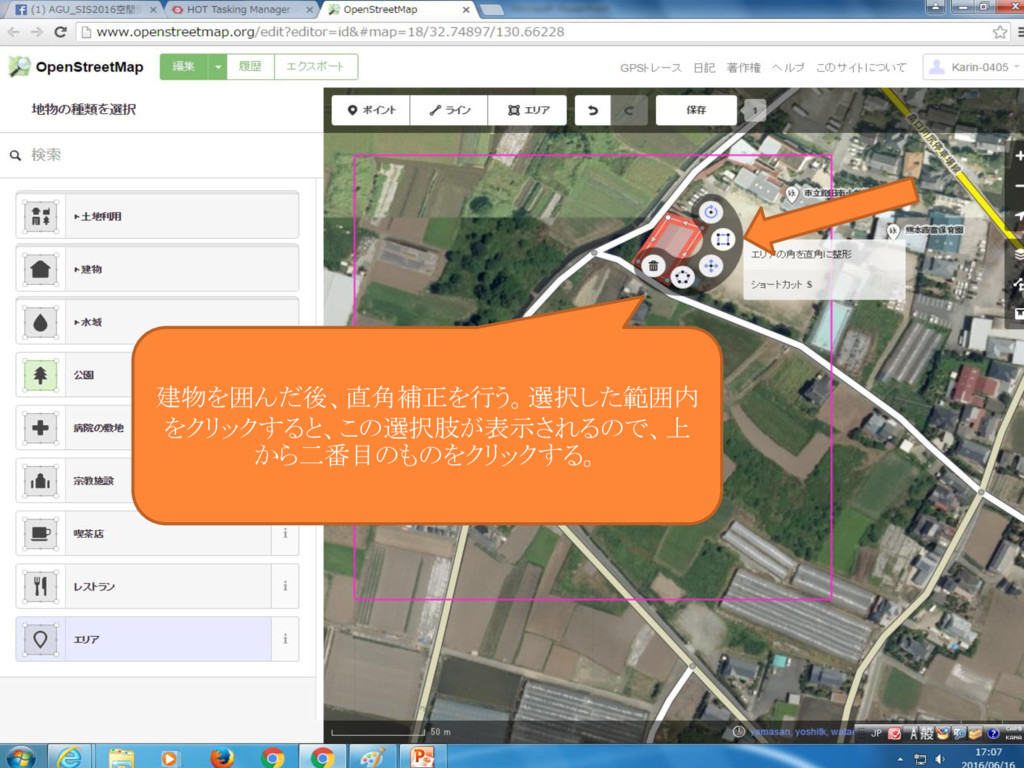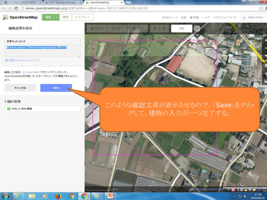 まず、FaceBookを開き、空間情報シ ステム入門のグループページから、今 日のタスクのうち、熊本市のものを選び、 クリックしてTasking Managerの ページに飛ぶ。