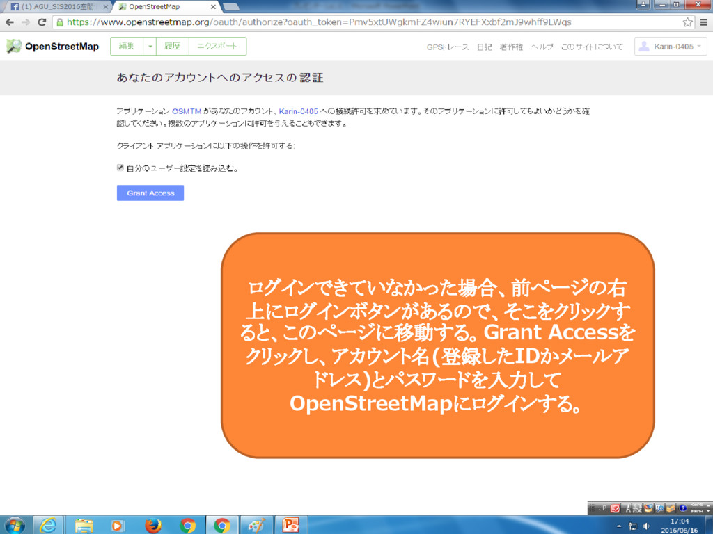 ログインできていなかった場合、前ページの右 上にログインボタンがあるので、そこをクリックす ると、このページに移動する。Grant Accessを クリックし、アカウント名(登録したIDかメールア ドレス)とパスワードを入力して OpenStreetMapにログインする。