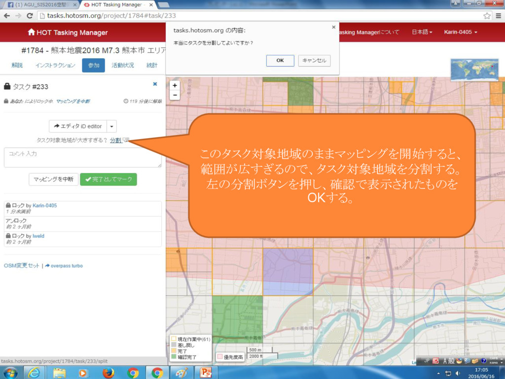 このタスク対象地域のままマッピングを開始すると、 範囲が広すぎるので、タスク対象地域を分割する。 左の分割ボタンを押し、確認で表示されたものを OKする。
