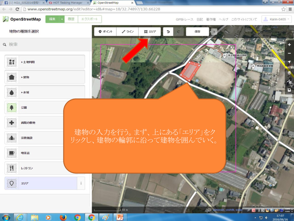 建物の入力を行う。まず、上にある「エリア」をク リックし、建物の輪郭に沿って建物を囲んでいく。