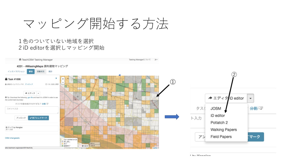 マッピング開始する⽅方法 1⾊色のついていない地域を選択 2iD editorを選択しマッピング開始 ②