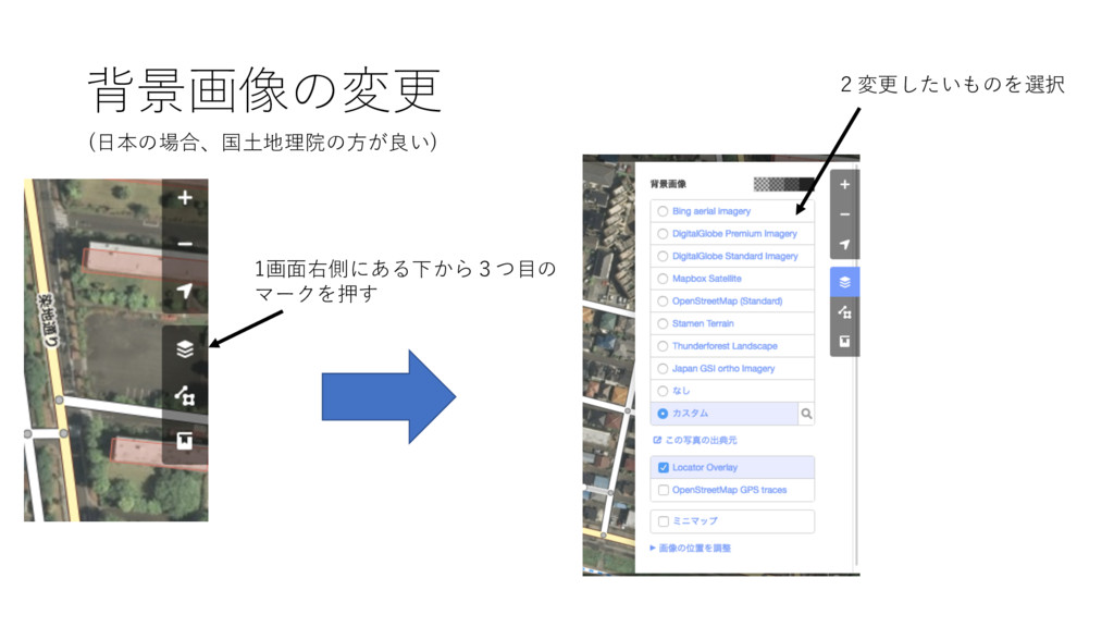 背景画像の変更 1画⾯面右側にある下から3つ⽬目の マークを押す 2変更したいものを選択 (⽇日本の場合、国⼟土地理院の⽅方が良い)