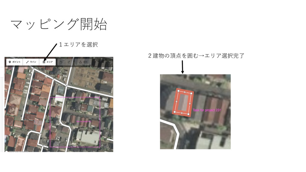 マッピング開始 1エリアを選択 2建物の頂点を囲む→エリア選択完了