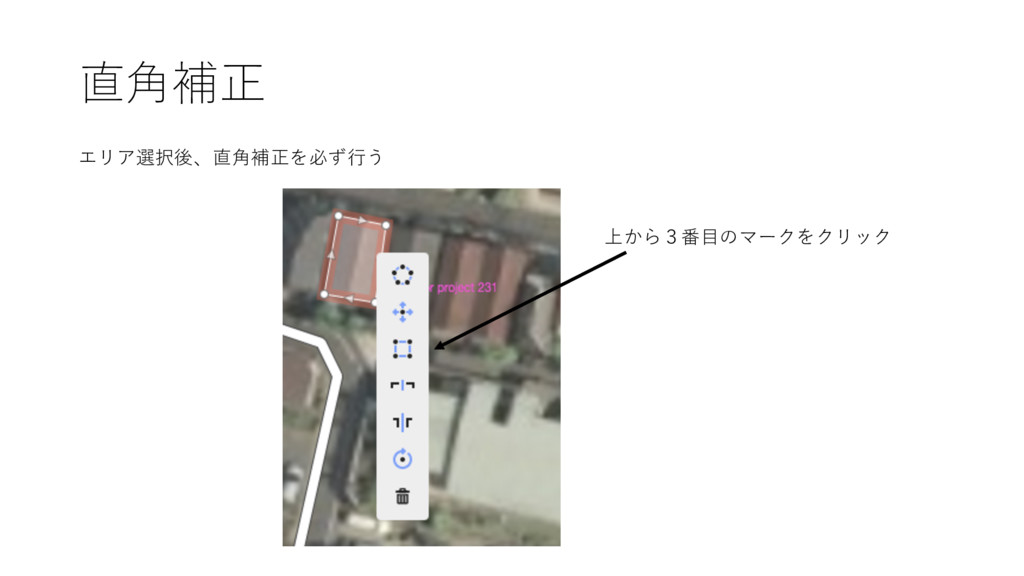 直⾓角補正 エリア選択後、直⾓角補正を必ず⾏行う 上から3番⽬目のマークをクリック