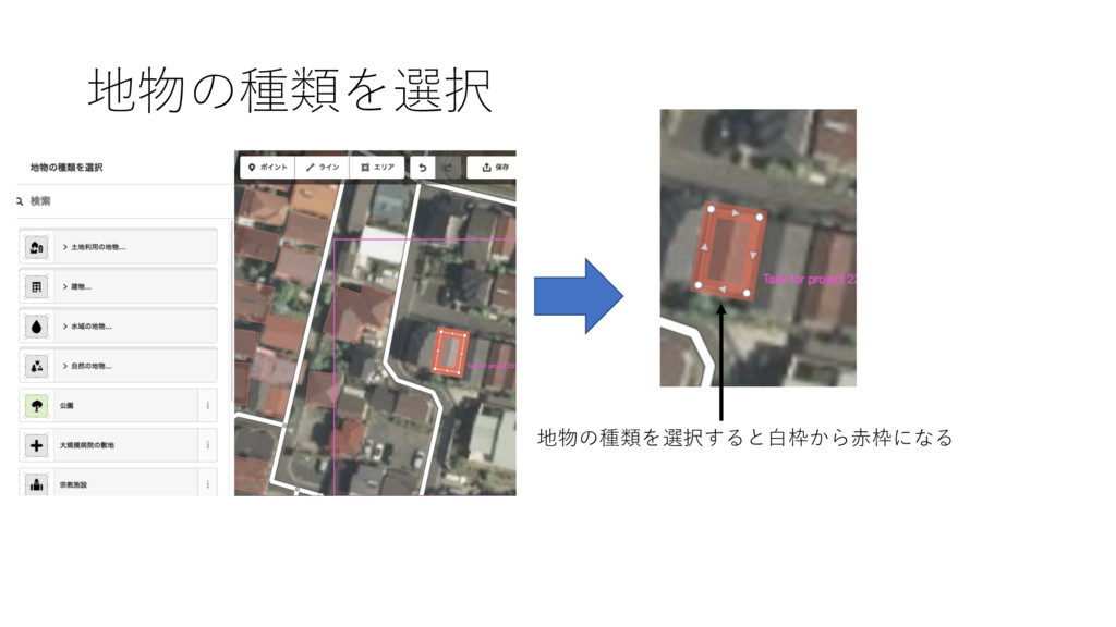 地物の種類を選択 地物の種類を選択すると⽩白枠から⾚赤枠になる