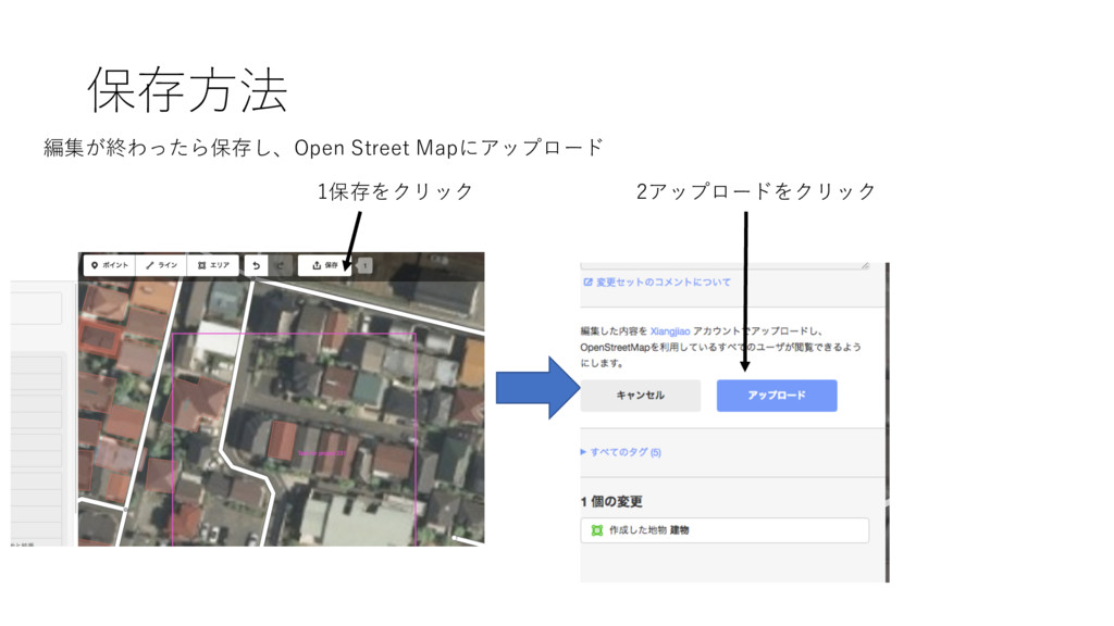 保存⽅方法 編集が終わったら保存し、Open Street Mapにアップロード 2アップロードをクリック 1保存をクリック