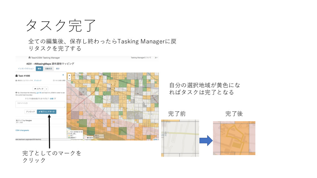 タスク完了 全ての編集後、保存し終わったらTasking Managerに戻 りタスクを完了する 完了としてのマークを クリック ⾃自分の選択地域が⻩黄⾊色にな ればタスクは完了となる 完了前 完了後