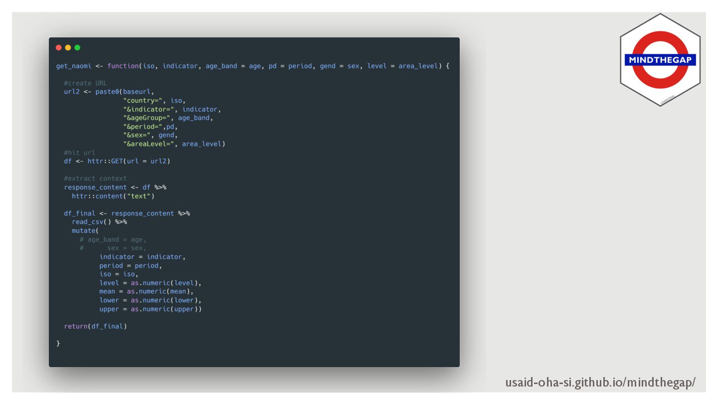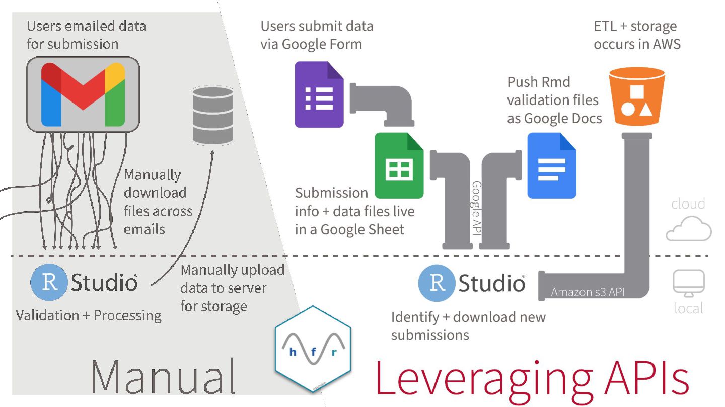 Efficient and scalable analytics workflows are critical for an adaptive and data-driven organization. How can we scale systems to support an office charged with implementing USAID's $6 billion HIV/AIDS program? Our team leveraged R and global health APIs to build more efficient workflows through automation by developing custom R packages to access health program data. Our investment in creating an automated data infrastructure with flexible, open-source tools like R enabled us to build reproducible workflows for analysts in over 50 partner countries. We would like to share our experience in a federal agency integrating APIs with R to develop scalable data pipelines, as inspiration for organizations facing similar resource & data challenges.