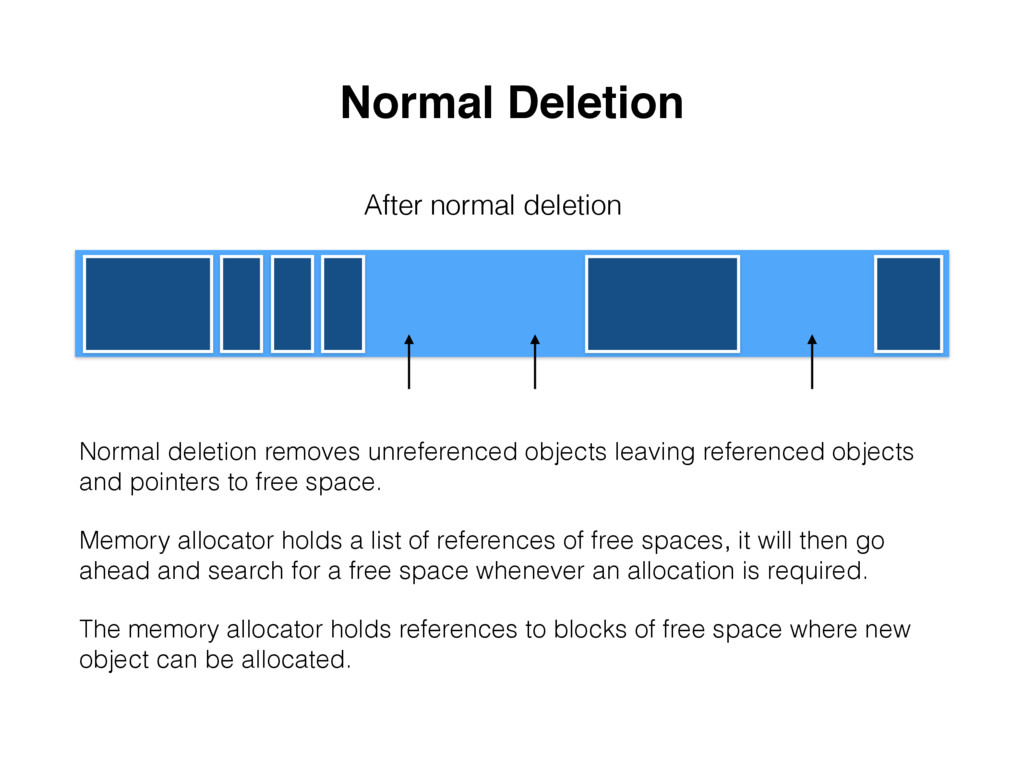 leaving referenced objects and pointers to free space. Memory allocator holds a list of references of free spaces, it will then go ahead and search for a free space whenever an allocation is required. The memory allocator holds references to blocks of free space where new object can be allocated.