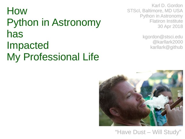 D. Gordon STScI, Baltimore, MD USA Python in Astronomy Flatiron Institute 30 Apr 2018 [email protected] @karllark2000 karllark@github “Have Dust – Will Study”