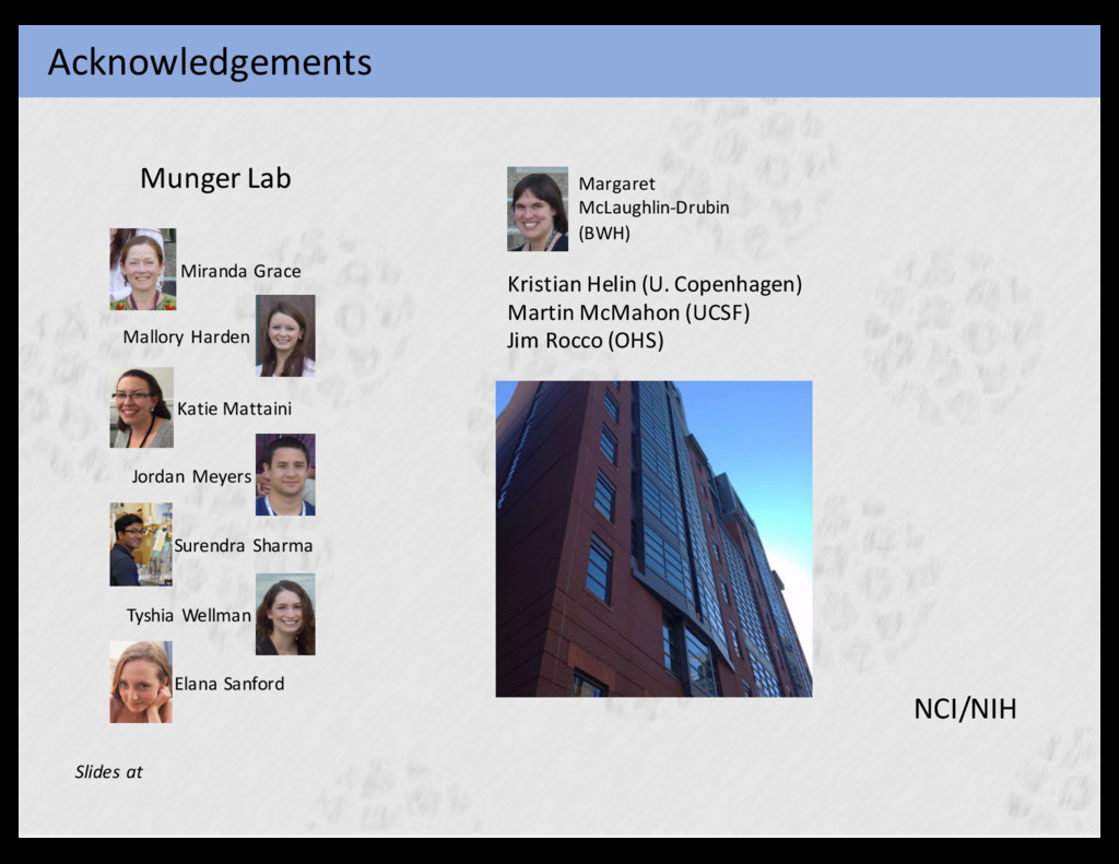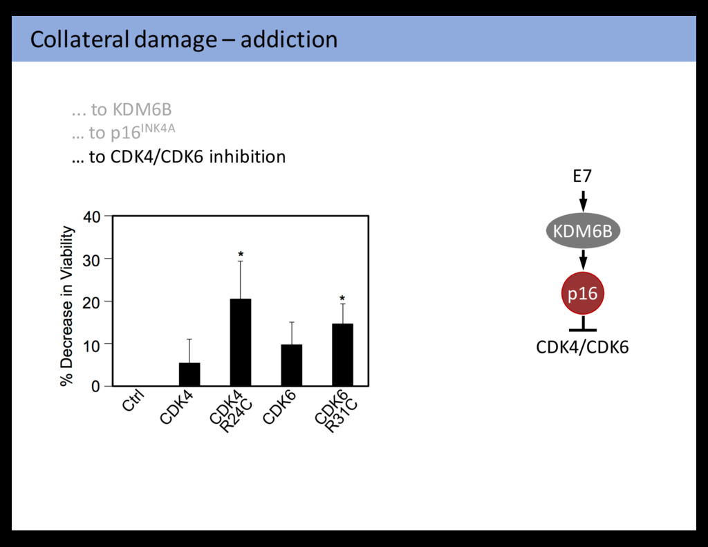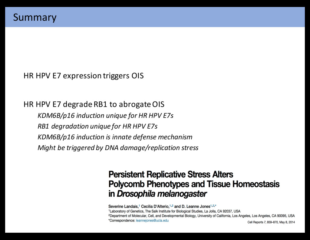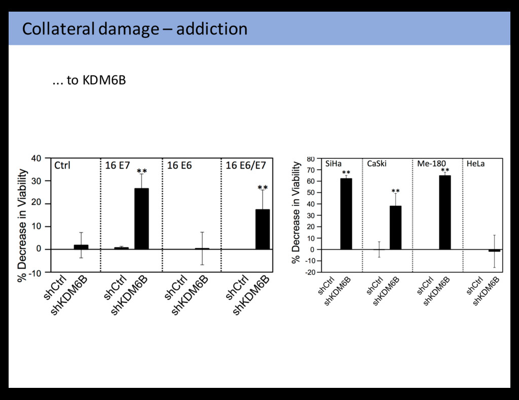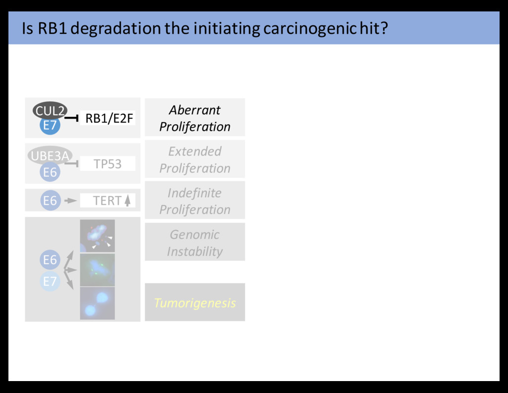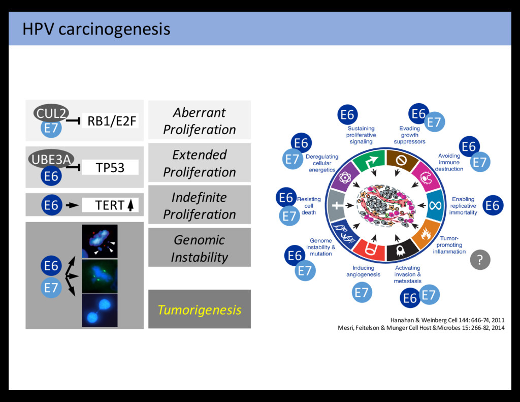 cancer cells to hyperactivate mitogenic signaling, enabling them to compensate for the initial attrition The six acquired capabilities—the hallmarks of c stood the test of time as being integral compon forms of cancer. Further refinement of these orga Figure 6. Therapeutic Targeting of the Hallmarks of Cancer Drugs that interfere with each of the acquired capabilities necessary for tumor growth and progression have been developed and are in clinical cases approved for clinical use in treating certain forms of human cancer. Additionally, the investigational drugs are being developed to ta enabling characteristics and emerging hallmarks depicted in Figure 3, which also hold promise as cancer therapeutics. The drugs listed ar examples; there is a deep pipeline of candidate drugs with different molecular targets and modes of action in development for most of these Hanahan & Weinberg Cell 144: 646-74, 2011 Aberrant Proliferation Genomic Instability E6 E7 Indefinite Proliferation TERT E6 Extended Proliferation TP53 UBE3A E6 RB1/E2F E7 CUL2 Tumorigenesis E6 E7 E6 E7 E6 ? E6 E7 E7 E6 E7 E6 E7 E6 E7 E6 Mesri, Feitelson & Munger Cell Host &Microbes 15: 266-82,2014 HPV carcinogenesis