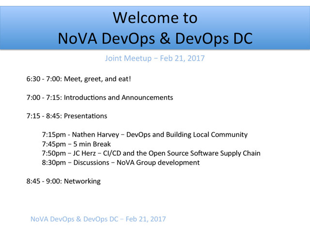 Feb 21, 2017 6:30 - 7:00: Meet, greet, and eat! 7:00 - 7:15: IntroducJons and Announcements 7:15 - 8:45: PresentaJons 7:15pm - Nathen Harvey – DevOps and Building Local Community 7:45pm – 5 min Break 7:50pm – JC Herz – CI/CD and the Open Source SoWware Supply Chain 8:30pm – Discussions – NoVA Group development 8:45 - 9:00: Networking NoVA DevOps & DevOps DC – Feb 21, 2017