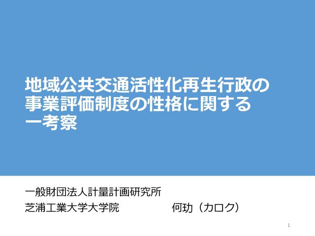地域公共交通活性化再生行政の 事業評価制度の性格に関する 一考察 一般財団法人計量計画研究所 芝浦工業大学大学院 何玏(カロク) 1