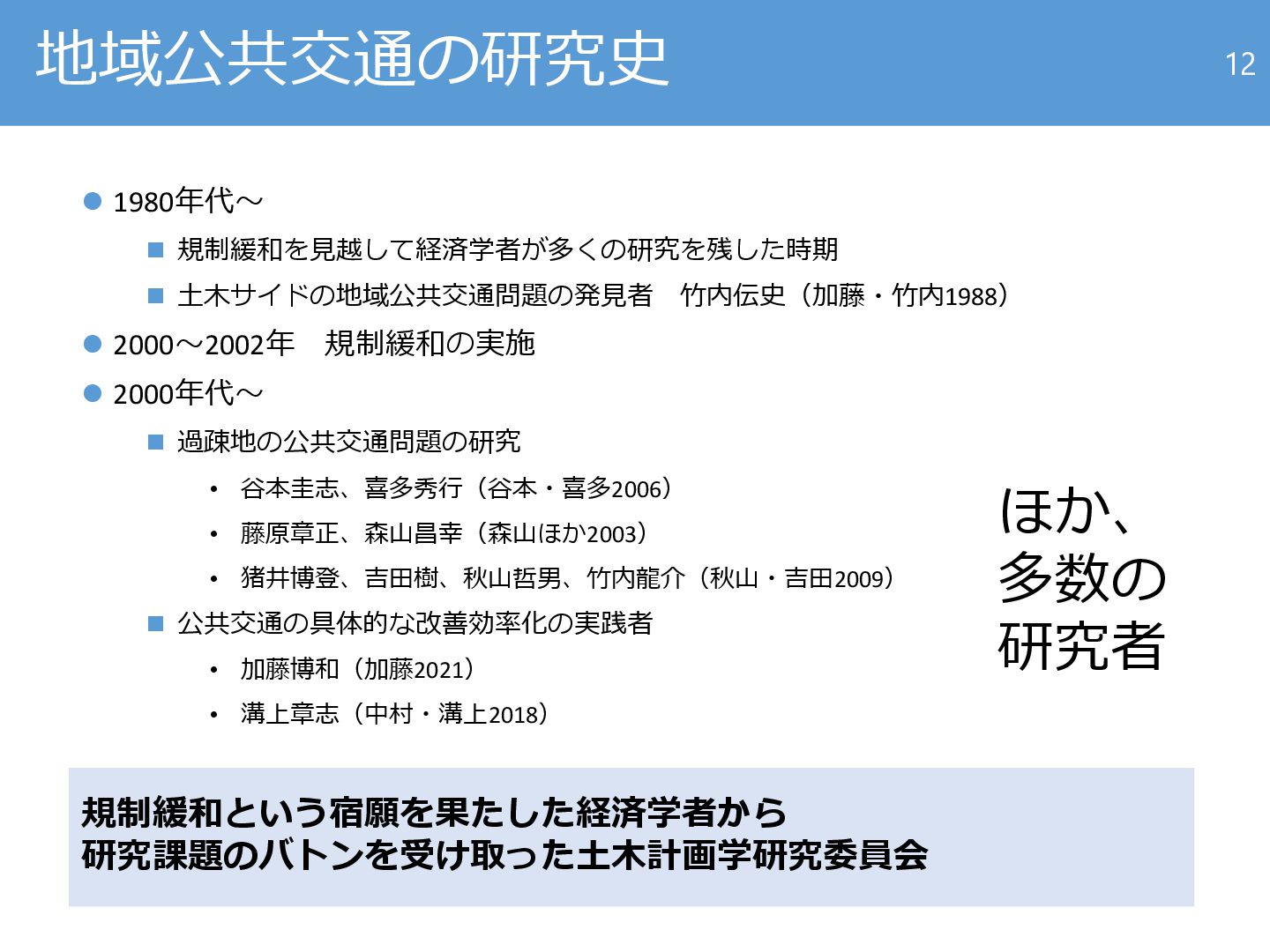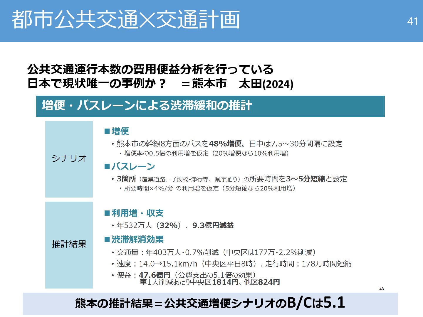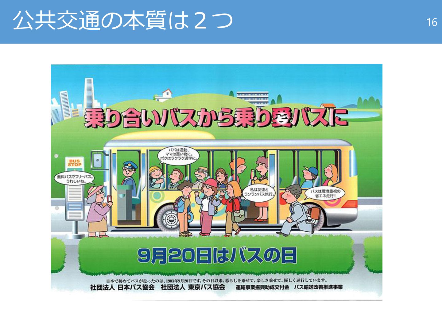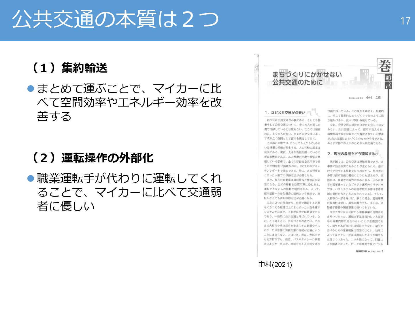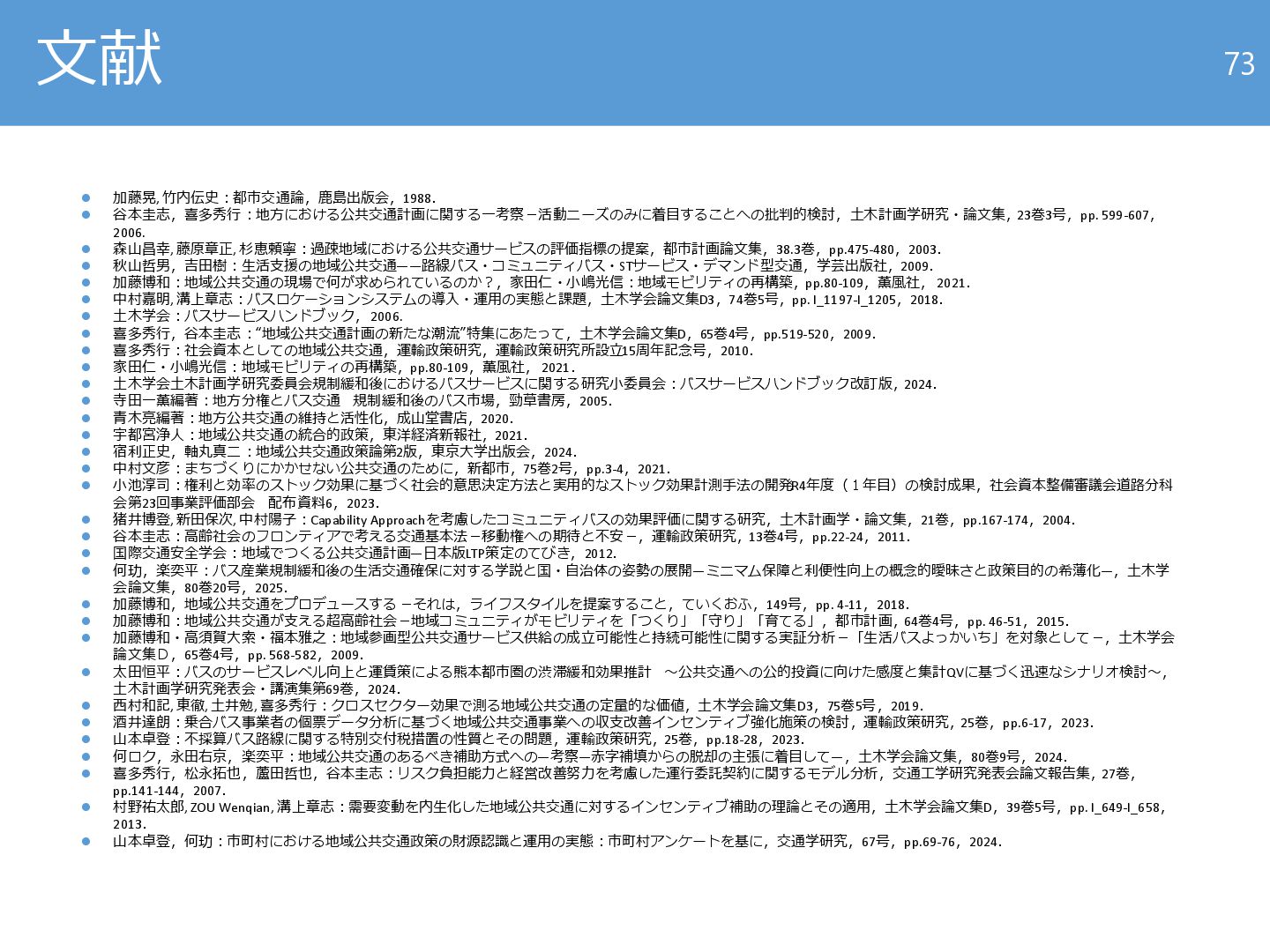 藤原章正, 杉恵頼寧:過疎地域における公共交通サービスの評価指標の提案,都市計画論文集,38.3巻,pp.475-480,2003. ⚫ 秋山哲男,吉田樹:生活支援の地域公共交通――路線バス・コミュニティバス・STサービス・デマンド型交通,学芸出版社,2009. ⚫ 加藤博和:地域公共交通の現場で何が求められているのか?,家田仁・小嶋光信:地域モビリティの再構築,pp.80-109,薫風社, 2021. ⚫ 中村嘉明, 溝上章志:バスロケーションシステムの導入・運用の実態と課題,土木学会論文集D3,74巻5号,pp. I_1197-I_1205,2018. ⚫ 土木学会:バスサービスハンドブック,2006. ⚫ 喜多秀行,谷本圭志:“地域公共交通計画の新たな潮流”特集にあたって,土木学会論文集D,65巻4号,pp.519-520,2009. ⚫ 喜多秀行:社会資本としての地域公共交通,運輸政策研究,運輸政策研究所設立15周年記念号,2010. ⚫ 家田仁・小嶋光信:地域モビリティの再構築,pp.80-109,薫風社, 2021. ⚫ 土木学会土木計画学研究委員会規制緩和後におけるバスサービスに関する研究小委員会:バスサービスハンドブック改訂版,2024. ⚫ 寺田一薫編著:地方分権とバス交通 規制緩和後のバス市場,勁草書房,2005. ⚫ 青木亮編著:地方公共交通の維持と活性化,成山堂書店,2020. ⚫ 宇都宮浄人:地域公共交通の統合的政策,東洋経済新報社,2021. ⚫ 宿利正史,軸丸真二:地域公共交通政策論第2版,東京大学出版会,2024. ⚫ 中村文彦:まちづくりにかかせない公共交通のために,新都市,75巻2号,pp.3-4,2021. ⚫ 小池淳司:権利と効率のストック効果に基づく社会的意思決定方法と実用的なストック効果計測手法の開発R4年度(1年目)の検討成果,社会資本整備審議会道路分科 会第23回事業評価部会 配布資料6,2023. ⚫ 猪井博登, 新田保次, 中村陽子:Capability Approachを考慮したコミュニティバスの効果評価に関する研究,土木計画学・論文集,21巻,pp.167-174,2004. ⚫ 谷本圭志:高齢社会のフロンティアで考える交通基本法-移動権への期待と不安-,運輸政策研究,13巻4号,pp.22-24,2011. ⚫ 国際交通安全学会:地域でつくる公共交通計画―日本版LTP策定のてびき,2012. ⚫ 何玏,楽奕平:バス産業規制緩和後の生活交通確保に対する学説と国・自治体の姿勢の展開―ミニマム保障と利便性向上の概念的曖昧さと政策目的の希薄化―,土木学 会論文集,80巻20号,2025. ⚫ 加藤博和,地域公共交通をプロデュースする-それは,ライフスタイルを提案すること,ていくおふ,149号,pp. 4-11,2018. ⚫ 加藤博和:地域公共交通が支える超高齢社会-地域コミュニティがモビリティを「つくり」「守り」「育てる」,都市計画,64巻4号,pp. 46-51,2015. ⚫ 加藤博和・高須賀大索・福本雅之:地域参画型公共交通サービス供給の成立可能性と持続可能性に関する実証分析-「生活バスよっかいち」を対象として-,土木学会 論文集D,65巻4号,pp. 568-582,2009. ⚫ 太田恒平:バスのサービスレベル向上と運賃策による熊本都市圏の渋滞緩和効果推計 ~公共交通への公的投資に向けた感度と集計QVに基づく迅速なシナリオ検討~, 土木計画学研究発表会・講演集第69巻,2024. ⚫ 西村和記, 東徹, 土井勉, 喜多秀行:クロスセクター効果で測る地域公共交通の定量的な価値,土木学会論文集D3,75巻5号,2019. ⚫ 酒井達朗:乗合バス事業者の個票データ分析に基づく地域公共交通事業への収支改善インセンティブ強化施策の検討,運輸政策研究,25巻,pp.6-17,2023. ⚫ 山本卓登:不採算バス路線に関する特別交付税措置の性質とその問題,運輸政策研究,25巻,pp.18-28,2023. ⚫ 何ロク,永田右京,楽奕平:地域公共交通のあるべき補助方式への―考察―赤字補填からの脱却の主張に着目して―,土木学会論文集,80巻9号,2024. ⚫ 喜多秀行,松永拓也,蘆田哲也,谷本圭志:リスク負担能力と経営改善努力を考慮した運行委託契約に関するモデル分析,交通工学研究発表会論文報告集,27巻, pp.141-144,2007. ⚫ 村野祐太郎, ZOU Wenqian, 溝上章志:需要変動を内生化した地域公共交通に対するインセンティブ補助の理論とその適用,土木学会論文集D,39巻5号,pp. I_649-I_658, 2013. ⚫ 山本卓登,何玏:市町村における地域公共交通政策の財源認識と運用の実態:市町村アンケートを基に,交通学研究,67号,pp.69-76,2024. 73