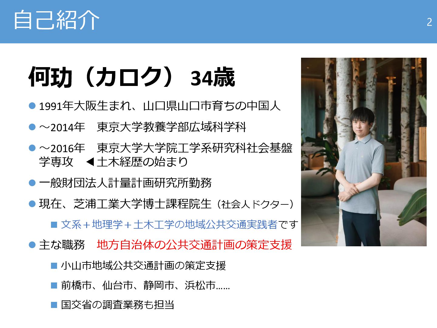 1. 自己紹介 何玏(カロク) 34歳 ⚫ 1991年大阪生まれ、山口県山口市育ちの中国人 ⚫ ~2014年 東京大学教養学部広域科学科 ⚫ ~2016年
