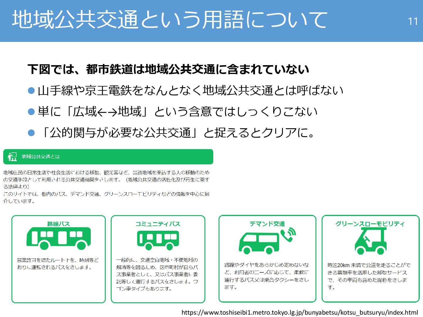 都市部における地域公共交通の役割をスルーして 新しい課題探しをすることは、順序として正しいですか? ⚫ 問題が複雑化して……と煮詰まる前に、地域公共交通の役割 を再評価しませんか? 10
