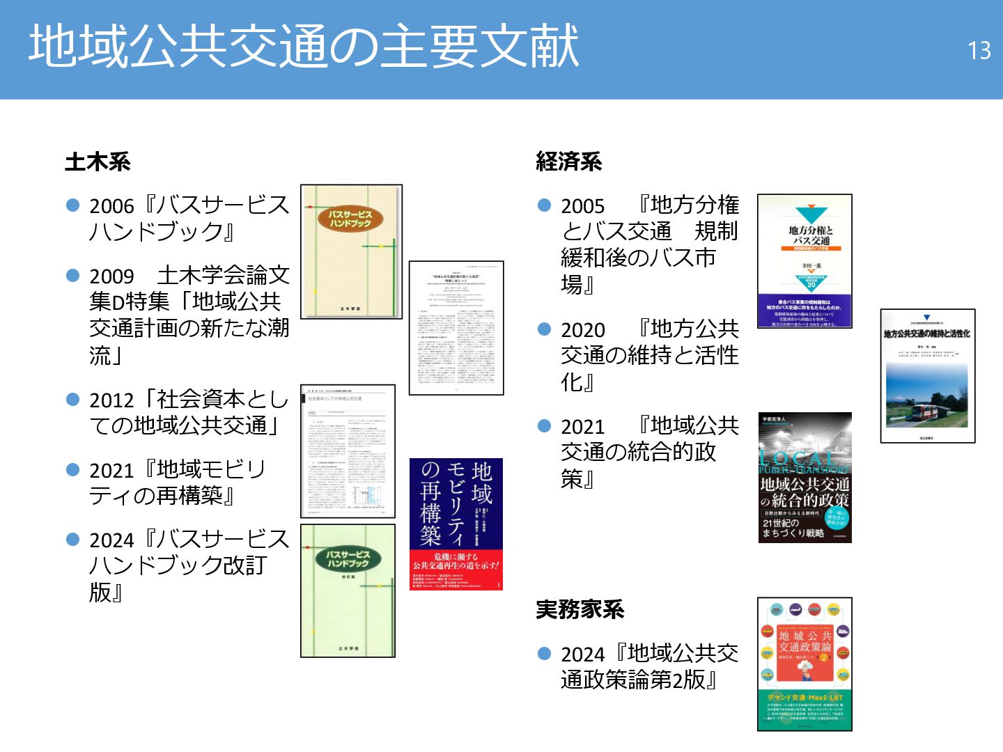 流」 ⚫ 2012「社会資本とし ての地域公共交通」 ⚫ 2021『地域モビリ ティの再構築』 ⚫ 2024『バスサービス ハンドブック改訂 版』 13 経済系 ⚫ 2005 『地方分権 とバス交通 規制 緩和後のバス市 場』 ⚫ 2020 『地方公共 交通の維持と活性 化』 ⚫ 2021 『地域公共 交通の統合的政 策』 実務家系 ⚫ 2024『地域公共交 通政策論第2版』