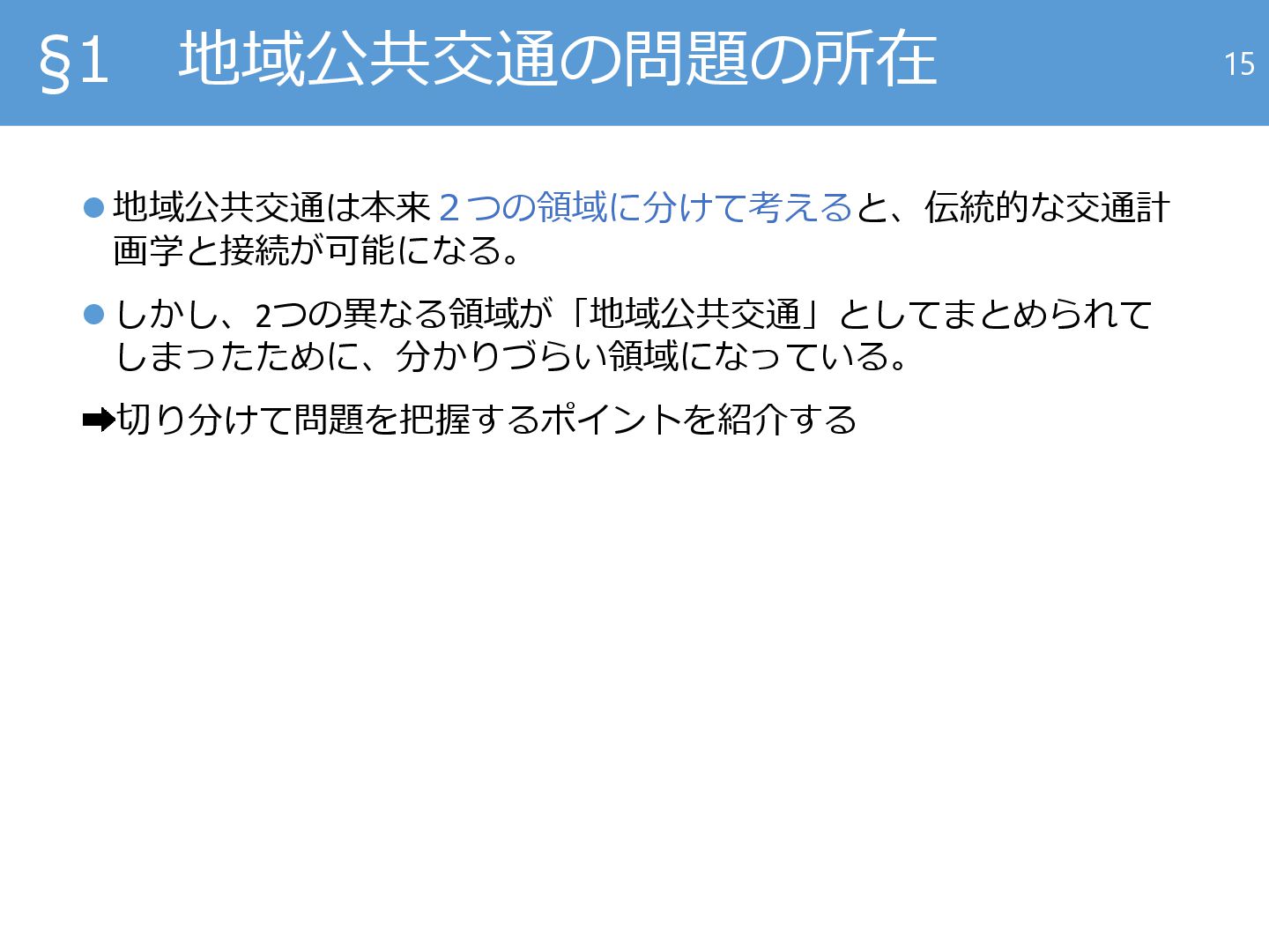 2. 地域公共交通研究の重要性 「地域公共交通って、コミュニティバスや過疎地 のオンデマンド交通の話とかでしょう?」 いいえ、違います。 地域公共交通 =不採算だが社会的に必要な公共交通 都市交通政策・まちづくりの領域で まだ嵌っていないピースが 「地域公共交通」 ⚫