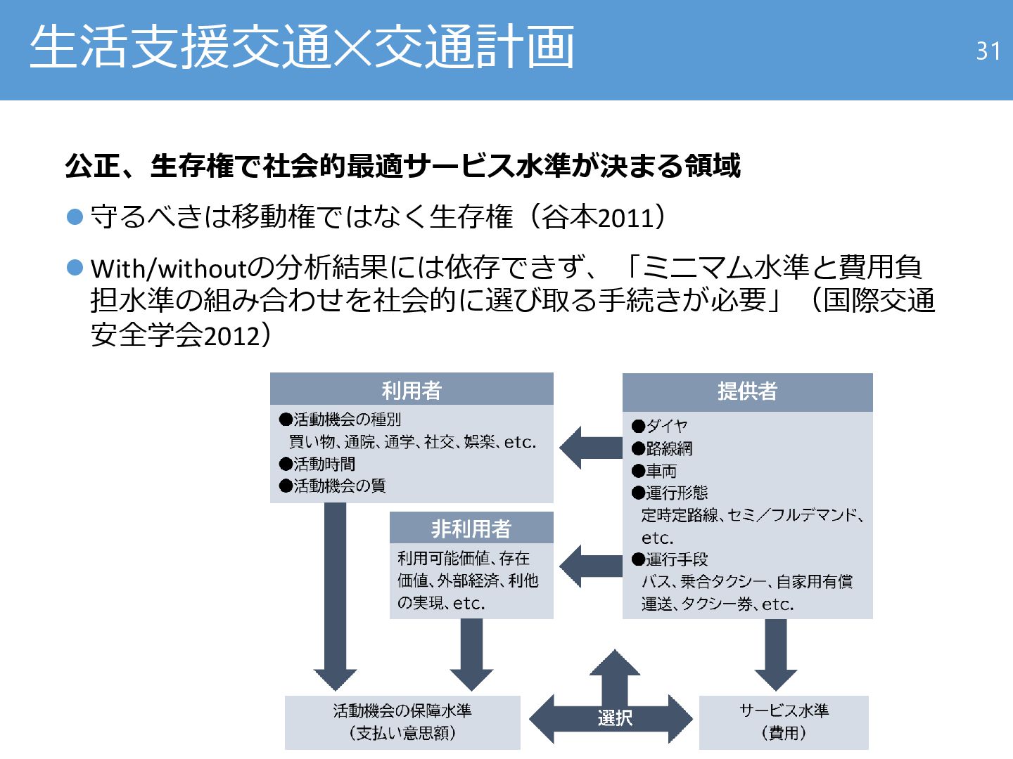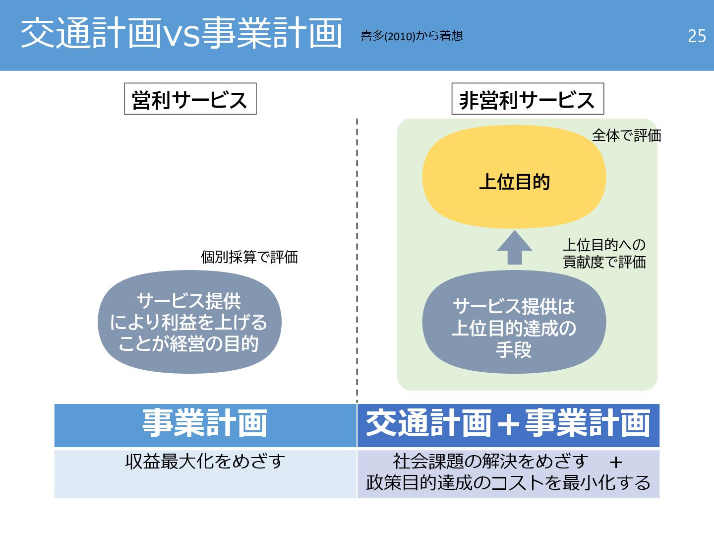 手段 個別採算で評価 全体で評価 上位目的への 貢献度で評価 事業計画 交通計画+事業計画 収益最大化をめざす 社会課題の解決をめざす + 政策目的達成のコストを最小化する 喜多(2010)から着想