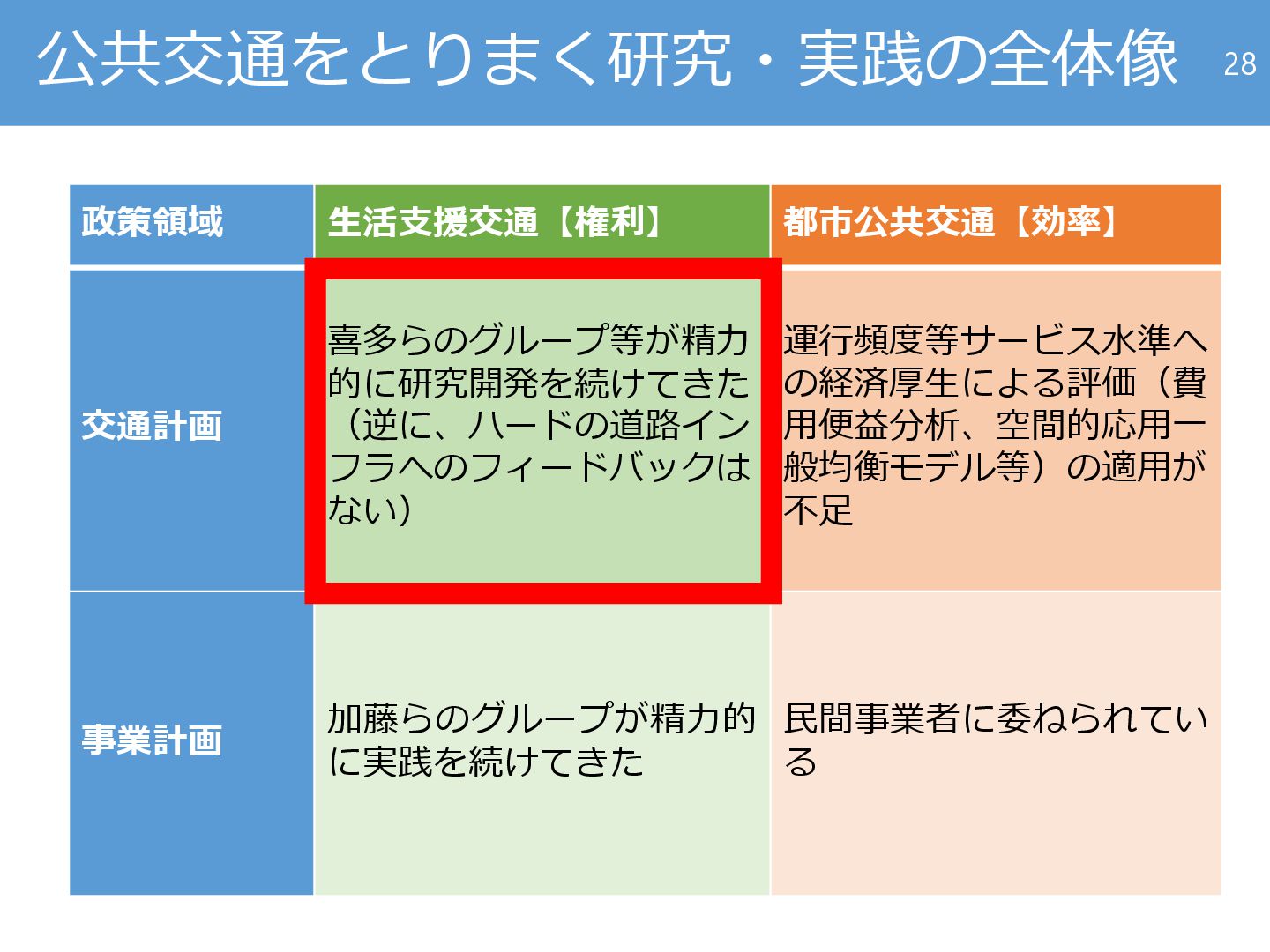 運行頻度等サービス水準へ の経済厚生による評価(費 用便益分析、空間的応用一 般均衡モデル等)の適用が 不足 事業計画 加藤らのグループが精力的 に実践を続けてきた 民間事業者に委ねられてい る 27