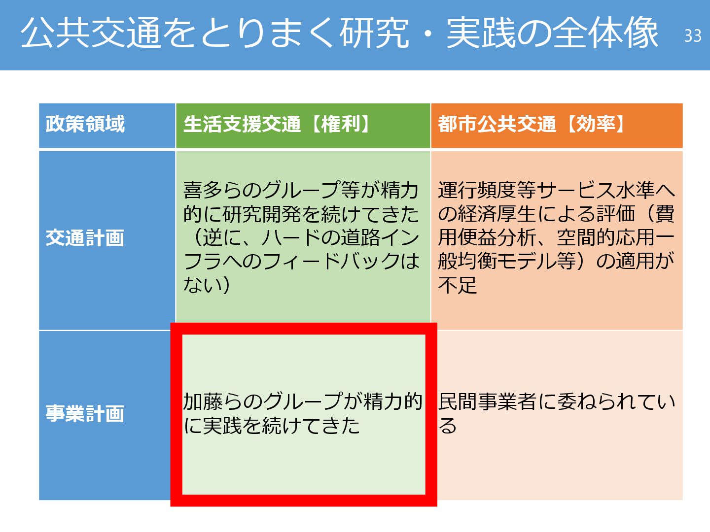 運行頻度等サービス水準へ の経済厚生による評価(費 用便益分析、空間的応用一 般均衡モデル等)の適用が 不足 事業計画 加藤らのグループが精力的 に実践を続けてきた 民間事業者に委ねられてい る 33