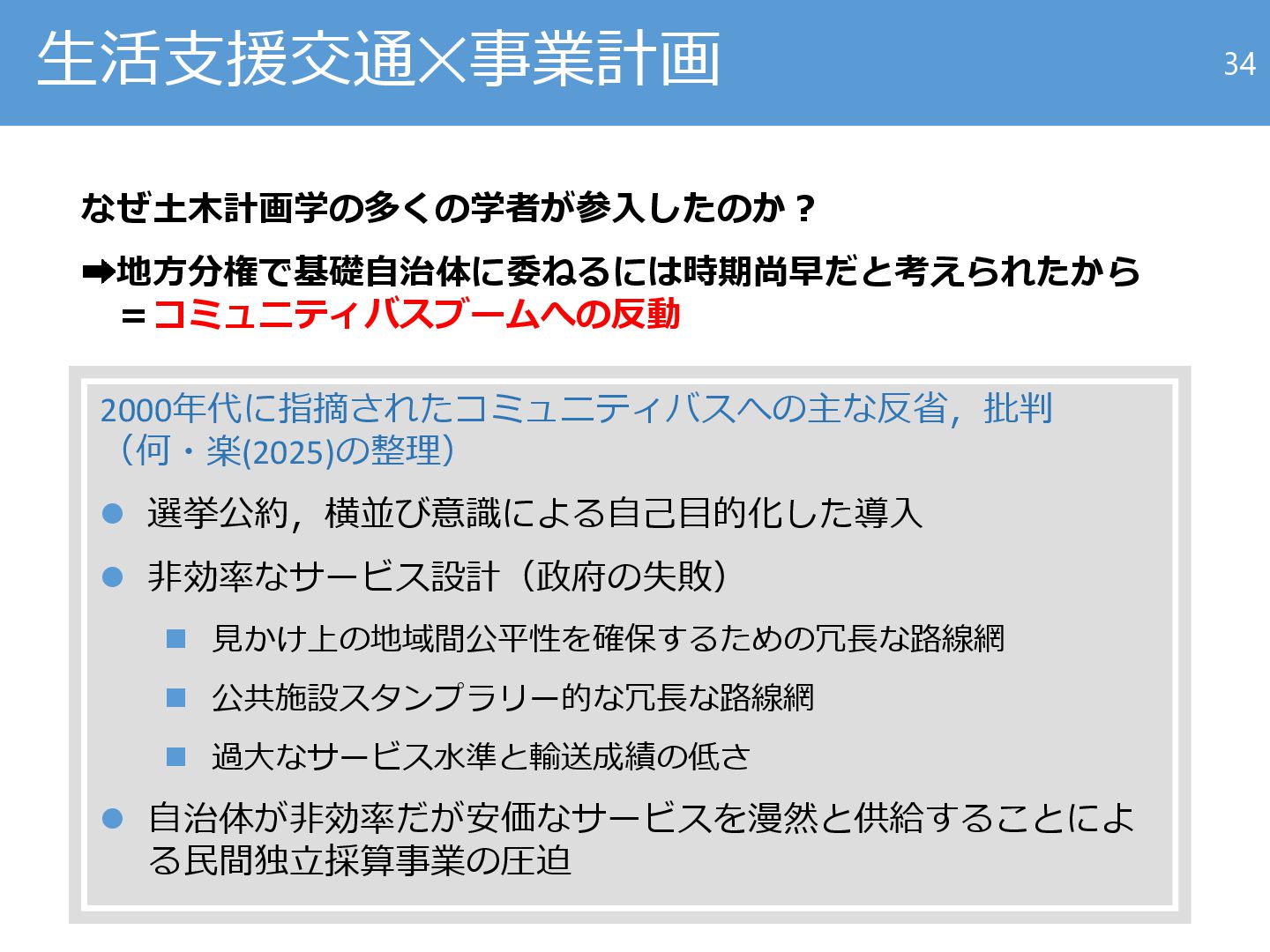 11. 生活支援交通✕事業計画 なぜ土木計画学の多くの学者が参入したのか? 地方分権で基礎自治体に委ねるには時期尚早だと考えられたから =コミュニティバスブームへの反動 34 2000年代に指摘されたコミュニティバスへの主な反省,批判 (何・楽(2025)の整理) ⚫ 選挙公約,横並び意識による自己目的化した導入 ⚫