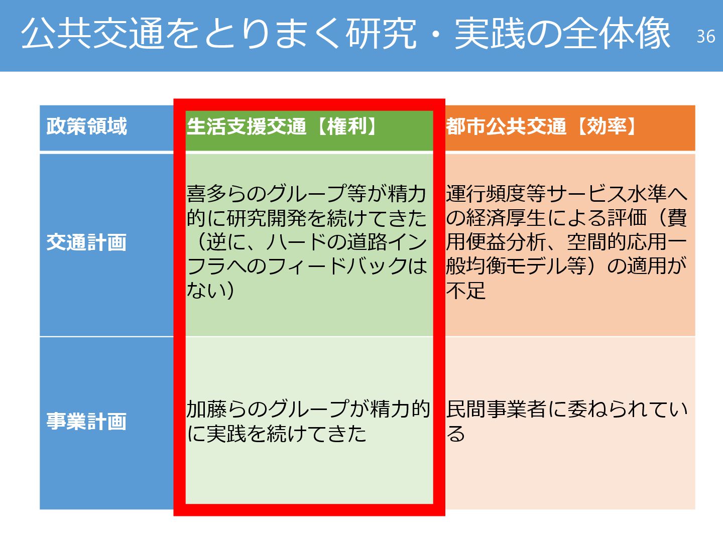 運行頻度等サービス水準へ の経済厚生による評価(費 用便益分析、空間的応用一 般均衡モデル等)の適用が 不足 事業計画 加藤らのグループが精力的 に実践を続けてきた 民間事業者に委ねられてい る 36