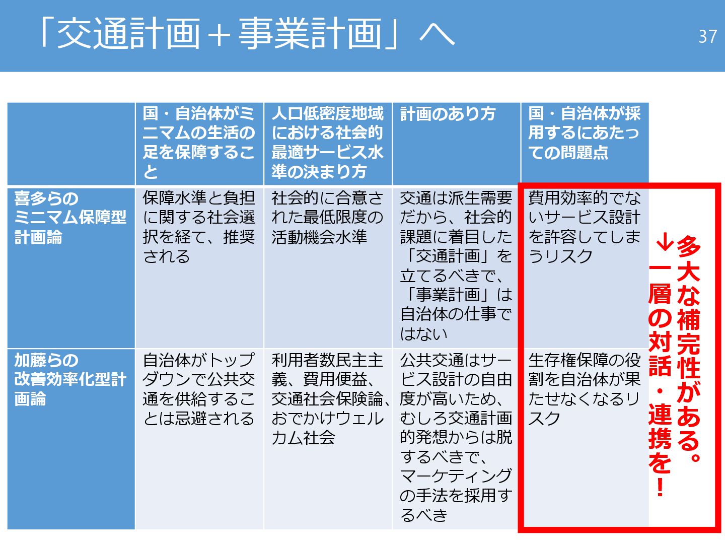 国・自治体が採 用するにあたっ ての問題点 喜多らの ミニマム保障型 計画論 保障水準と負担 に関する社会選 択を経て、推奨 される 社会的に合意さ れた最低限度の 活動機会水準 交通は派生需要 だから、社会的 課題に着目した 「交通計画」を 立てるべきで、 「事業計画」は 自治体の仕事で はない 費用効率的でな いサービス設計 を許容してしま うリスク 加藤らの 改善効率化型計 画論 自治体がトップ ダウンで公共交 通を供給するこ とは忌避される 利用者数民主主 義、費用便益、 交通社会保険論、 おでかけウェル カム社会 公共交通はサー ビス設計の自由 度が高いため、 むしろ交通計画 的発想からは脱 するべきで、 マーケティング の手法を採用す るべき 生存権保障の役 割を自治体が果 たせなくなるリ スク 37 多 大 な 補 完 性 が あ る 。 → 一 層 の 対 話 ・ 連 携 を !