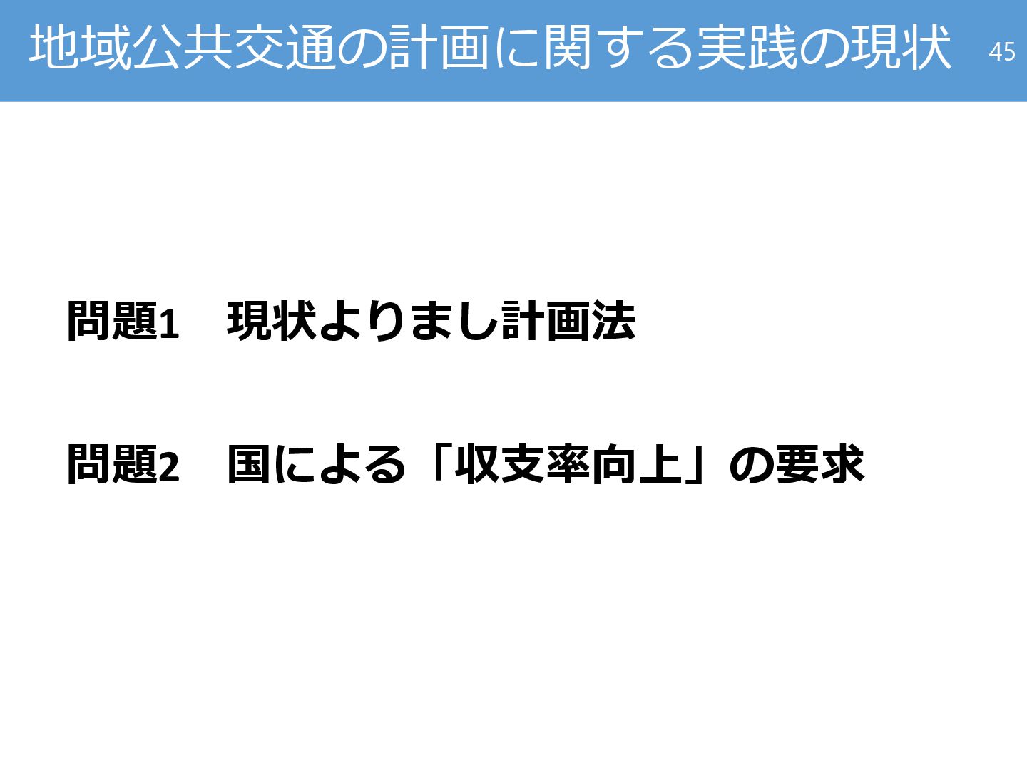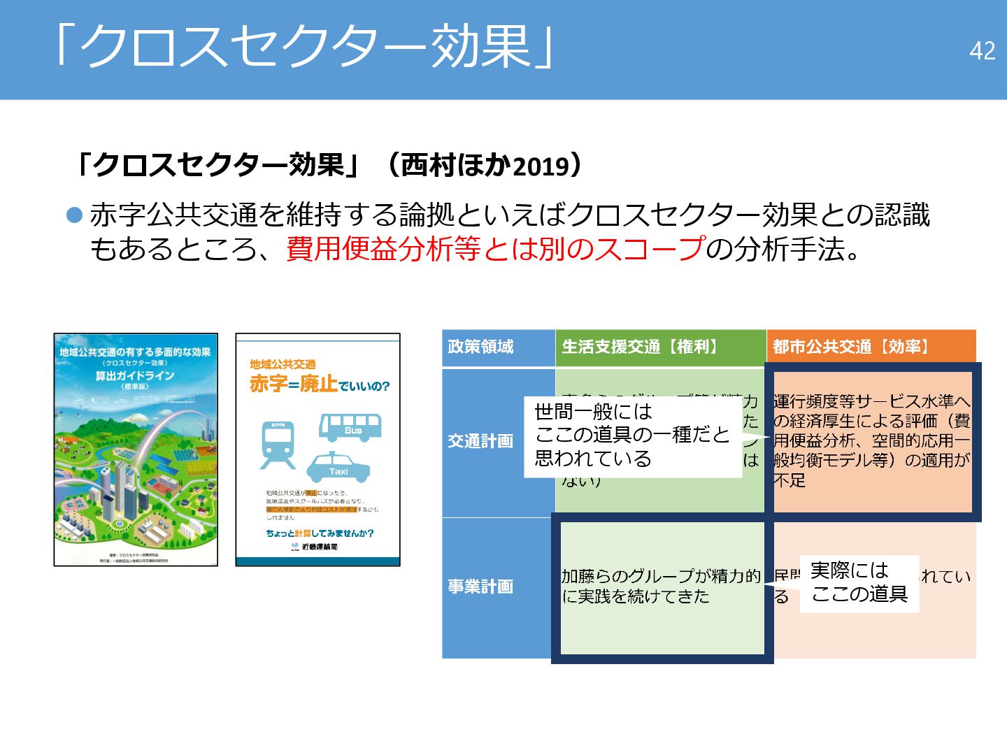 運行頻度等サービス水準へ の経済厚生による評価(費 用便益分析、空間的応用一 般均衡モデル等)の適用が 不足 事業計画 加藤らのグループが精力的 に実践を続けてきた 民間事業者に委ねられてい る 43