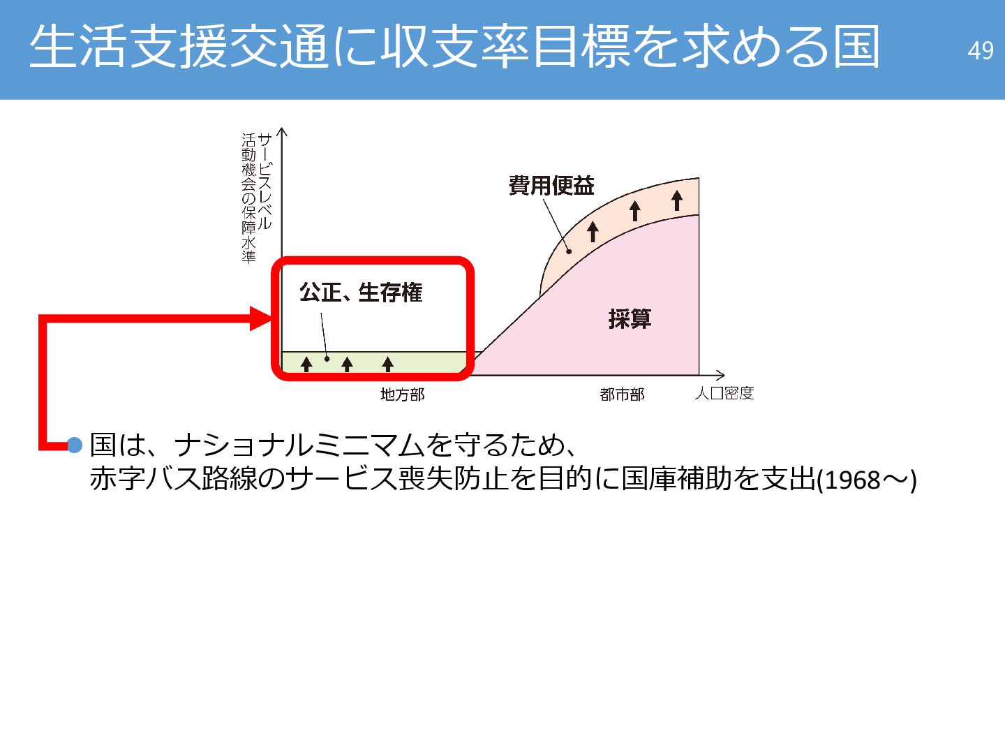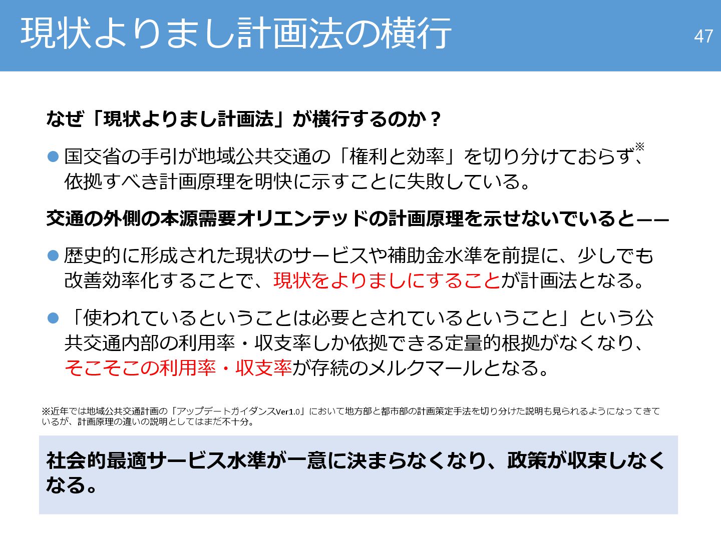 「使われているということは必要とされているということ」という公 共交通内部の利用率・収支率しか依拠できる定量的根拠がなくなり、 そこそこの利用率・収支率が存続のメルクマールとなる。 47 社会的最適サービス水準が一意に決まらなくなり、政策が収束しなく なる。 ※ ※近年では地域公共交通計画の「アップデートガイダンスVer1.0」において地方部と都市部の計画策定手法を切り分けた説明も見られるようになってきて いるが、計画原理の違いの説明としてはまだ不十分。