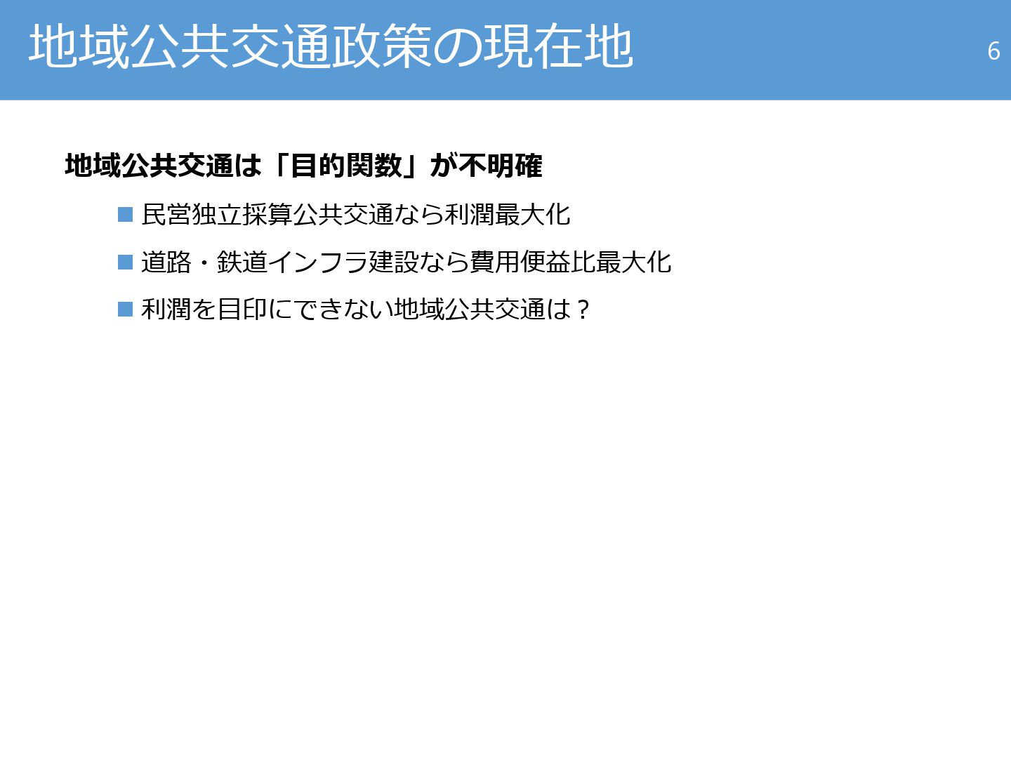 6. 交通計画vs事業計画 25 営利サービス 非営利サービス サービス提供 により利益を上げる ことが経営の目的 上位目的 サービス提供は 上位目的達成の
