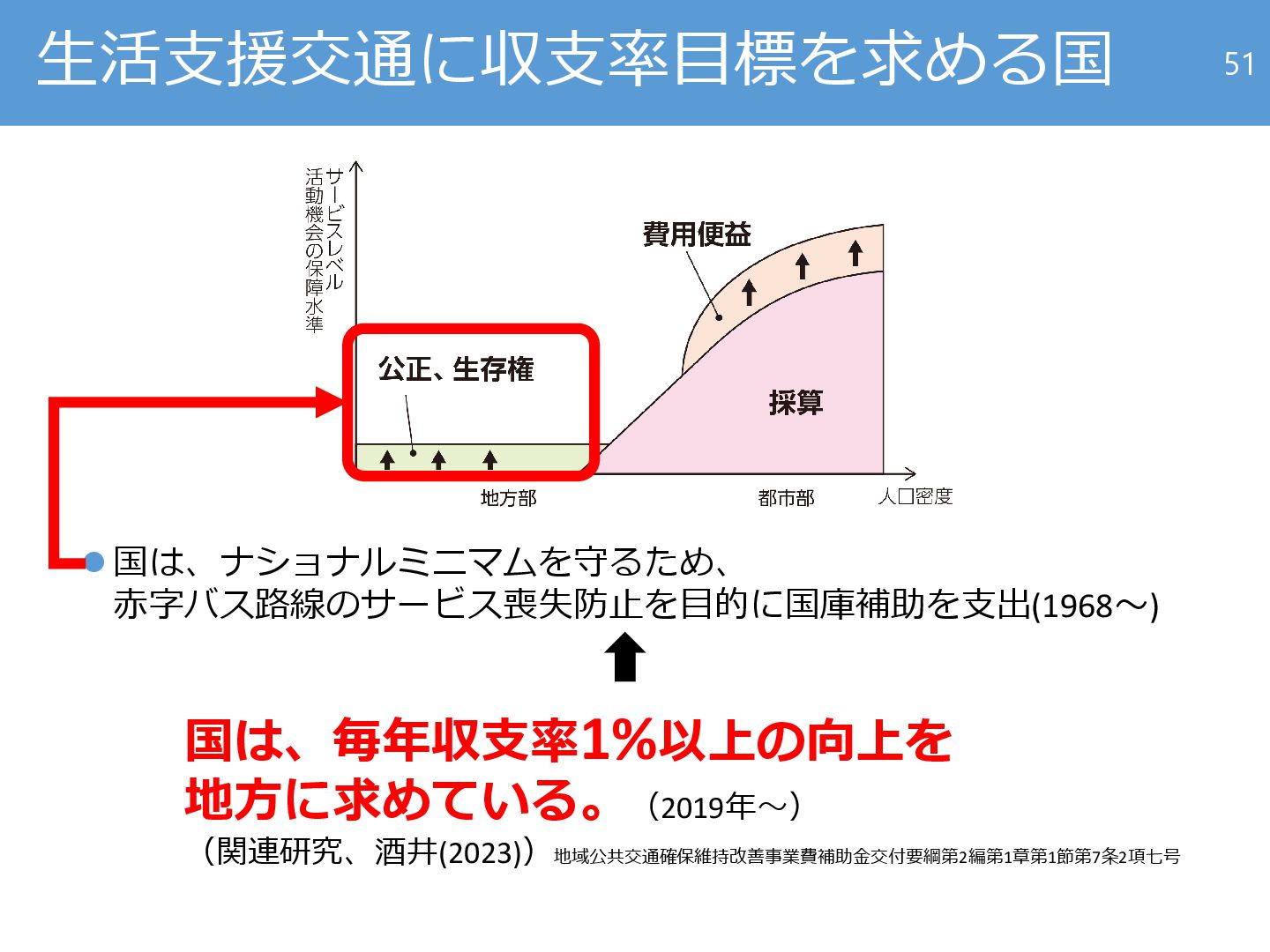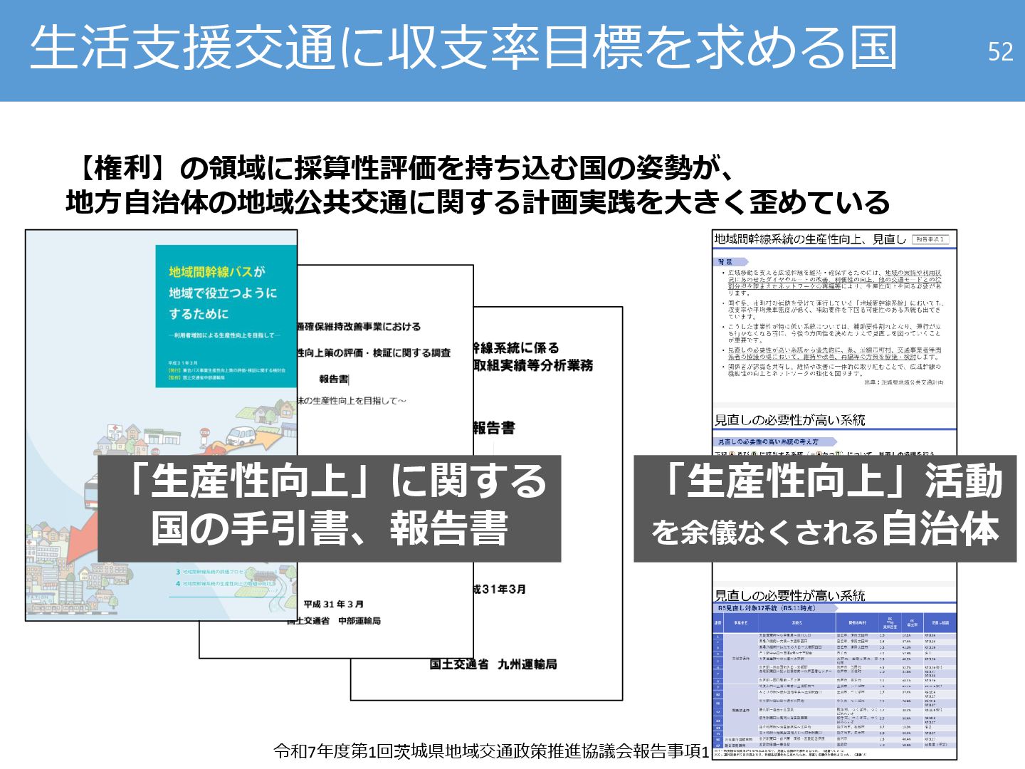 の勧告」(2024~) ⚫ 「東京で区立児童相談所の設置断念が相次ぐ 人手不足受け都立と 連携」(日本経済新聞2025年5月29日付) 48 社会的意思決定なきまま運転手不足を所与の条件とみなして現状追認 するのは、土木計画学の教えとは違うのではないか 細かく言えば地域公共交通確保維持改善事業で人件費の改善をヤードスティック型補助基準から切り離す改正が行われ たが、地域公共交通全体から見れば、効果が及ぶ範囲は極めて限定的。