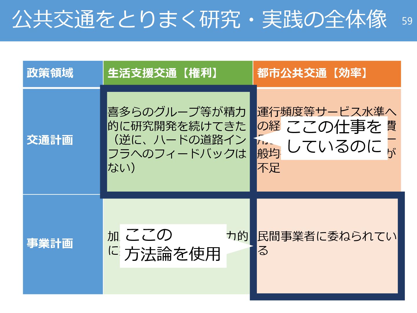 21. 公共交通をとりまく研究・実践の全体像 政策領域 生活支援交通【権利】 都市公共交通【効率】 交通計画 喜多らのグループ等が精力 的に研究開発を続けてきた (逆に、ハードの道路イン フラへのフィードバックは ない)