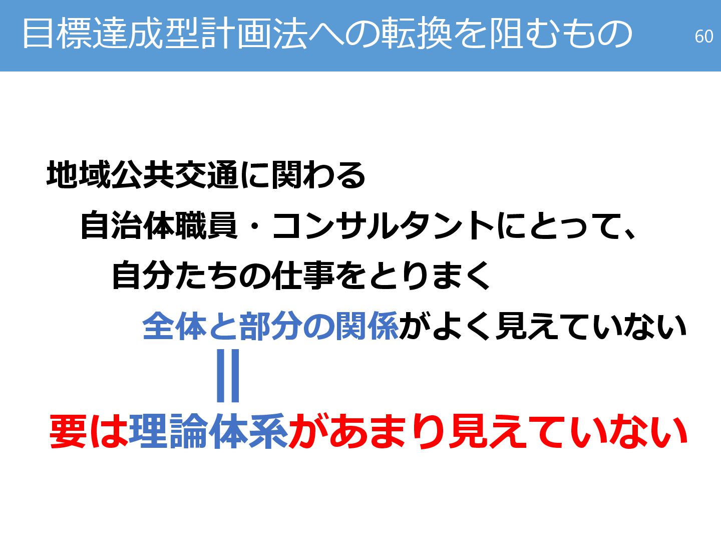 運行頻度等サービス水準へ の経済厚生による評価(費 用便益分析、空間的応用一 般均衡モデル等)の適用が 不足 事業計画 加藤らのグループが精力的 に実践を続けてきた 民間事業者に委ねられてい る 59 ここの仕事を しているのに ここの 方法論を使用