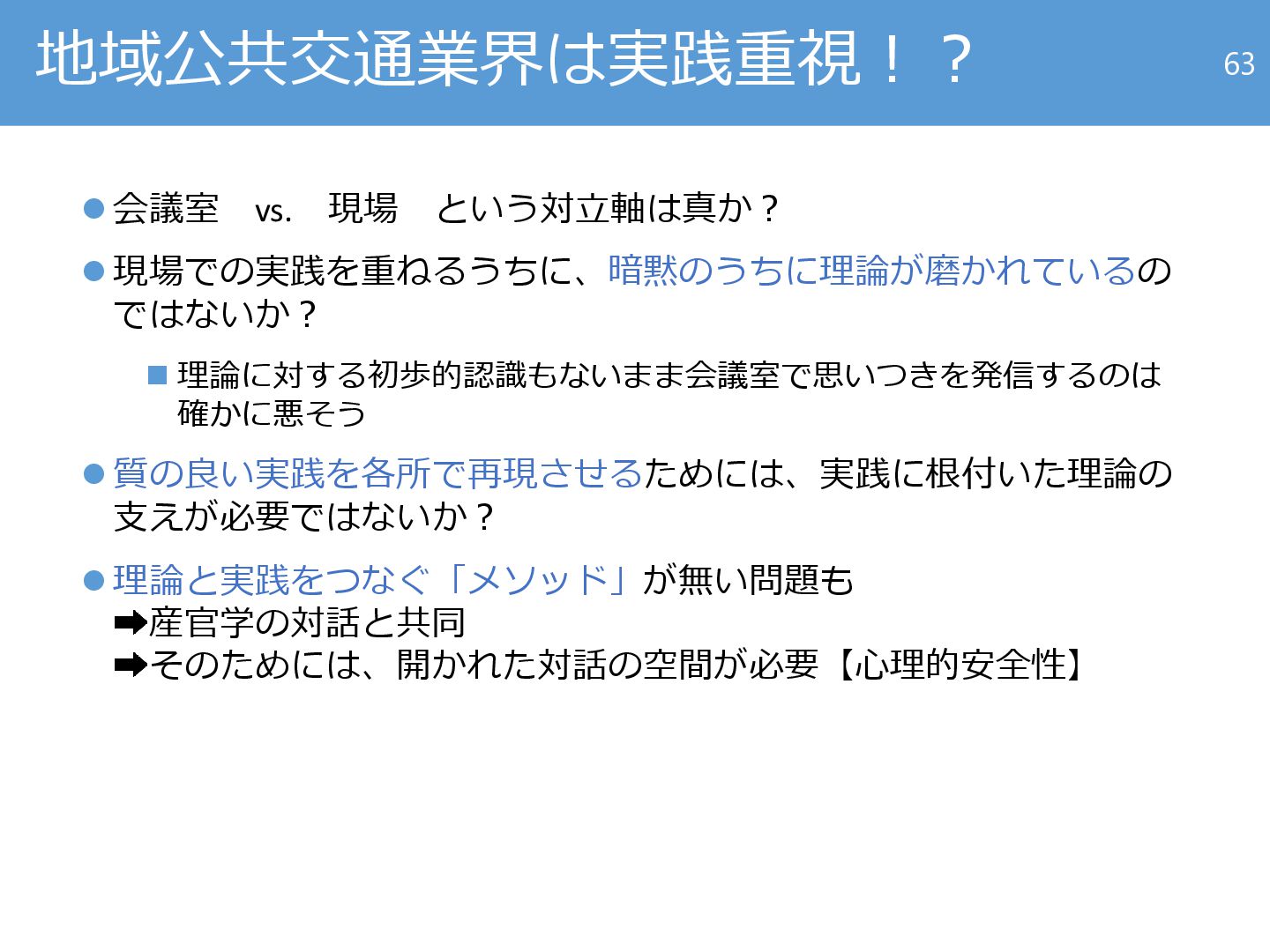理論に対する初歩的認識もないまま会議室で思いつきを発信するのは 確かに悪そう ⚫ 質の良い実践を各所で再現させるためには、実践に根付いた理論の 支えが必要ではないか? ⚫ 理論と実践をつなぐ「メソッド」が無い問題も 産官学の対話と共同 そのためには、開かれた対話の空間が必要【心理的安全性】 63