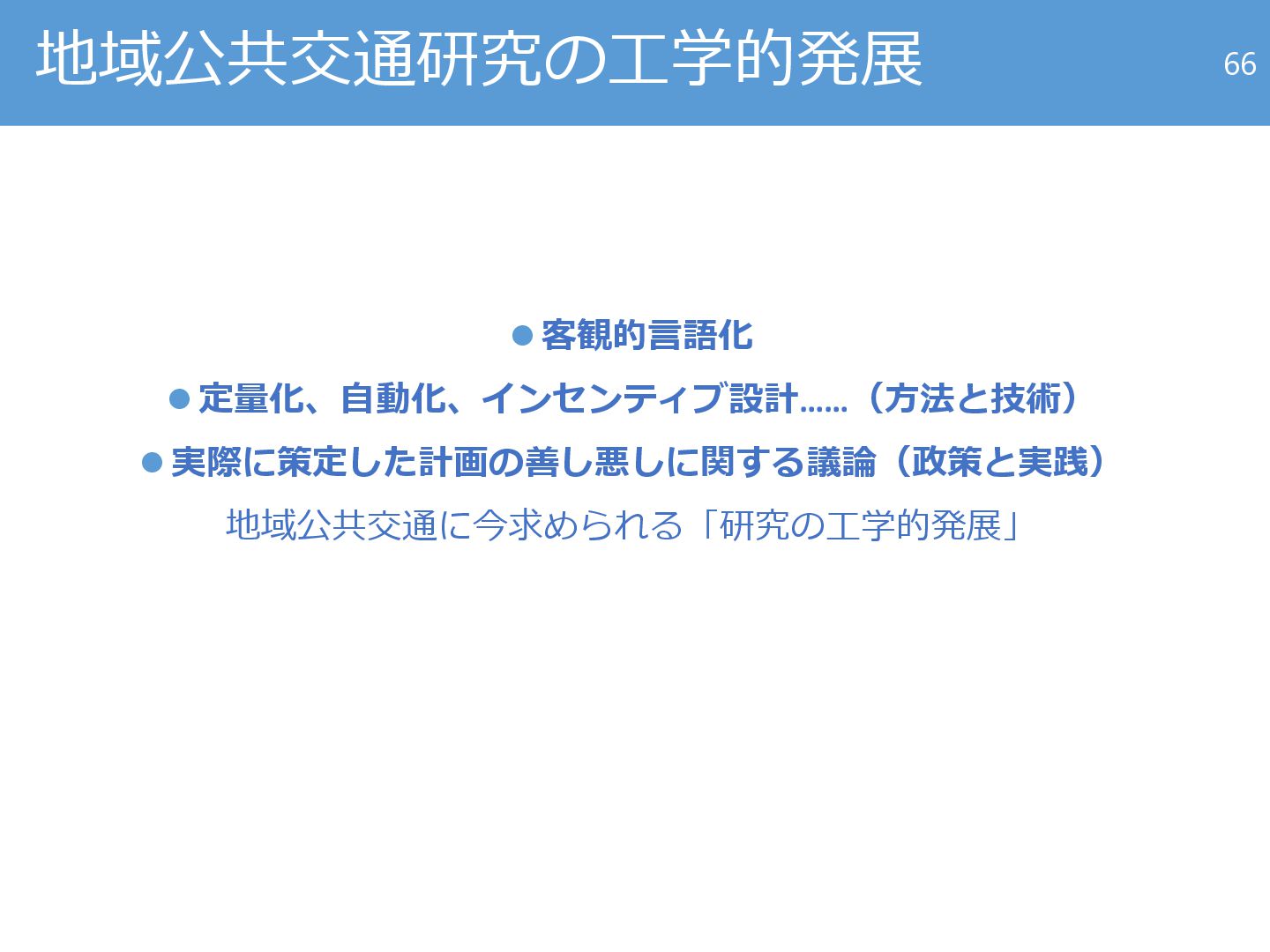 24. 地域公共交通研究の工学的発展 目標達成型計画法の実現に必要な研究課題 65 社会目標 ⚫ 渋滞削減 ⚫ 誰でも移動できる ⚫ 可処分所得増