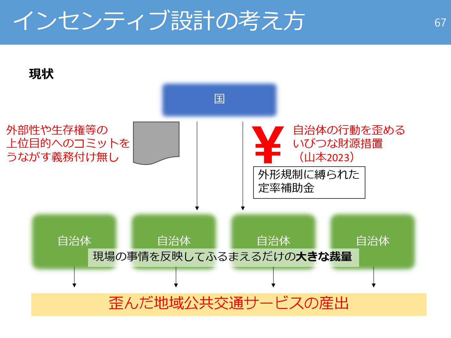 25. インセンティブ設計の考え方 現状 67 国 外部性や生存権等の 上位目的へのコミットを うながす義務付け無し ¥自治体の行動を歪める いびつな財源措置 (山本2023)