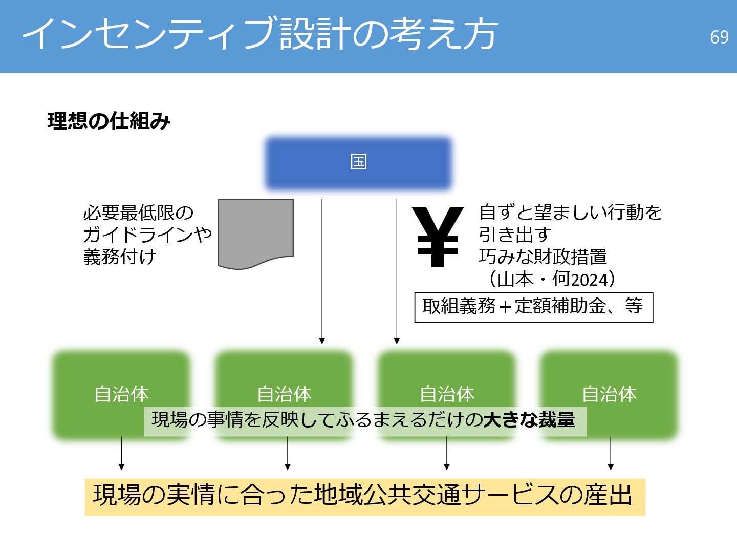 (山本・何2024) 自治体 自治体 自治体 自治体 現場の事情を反映してふるまえるだけの大きな裁量 現場の実情に合った地域公共交通サービスの産出 取組義務+定額補助金、等