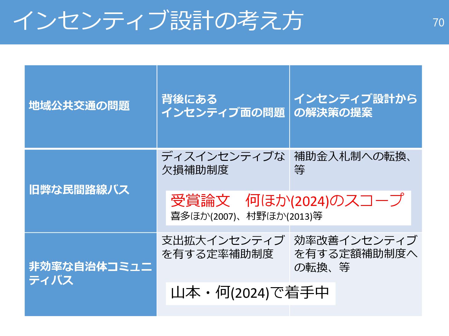 等 非効率な自治体コミュニ ティバス 支出拡大インセンティブ を有する定率補助制度 効率改善インセンティブ を有する定額補助制度へ の転換、等 70 受賞論文 何ほか(2024)のスコープ 喜多ほか(2007)、村野ほか(2013)等 山本・何(2024)で着手中