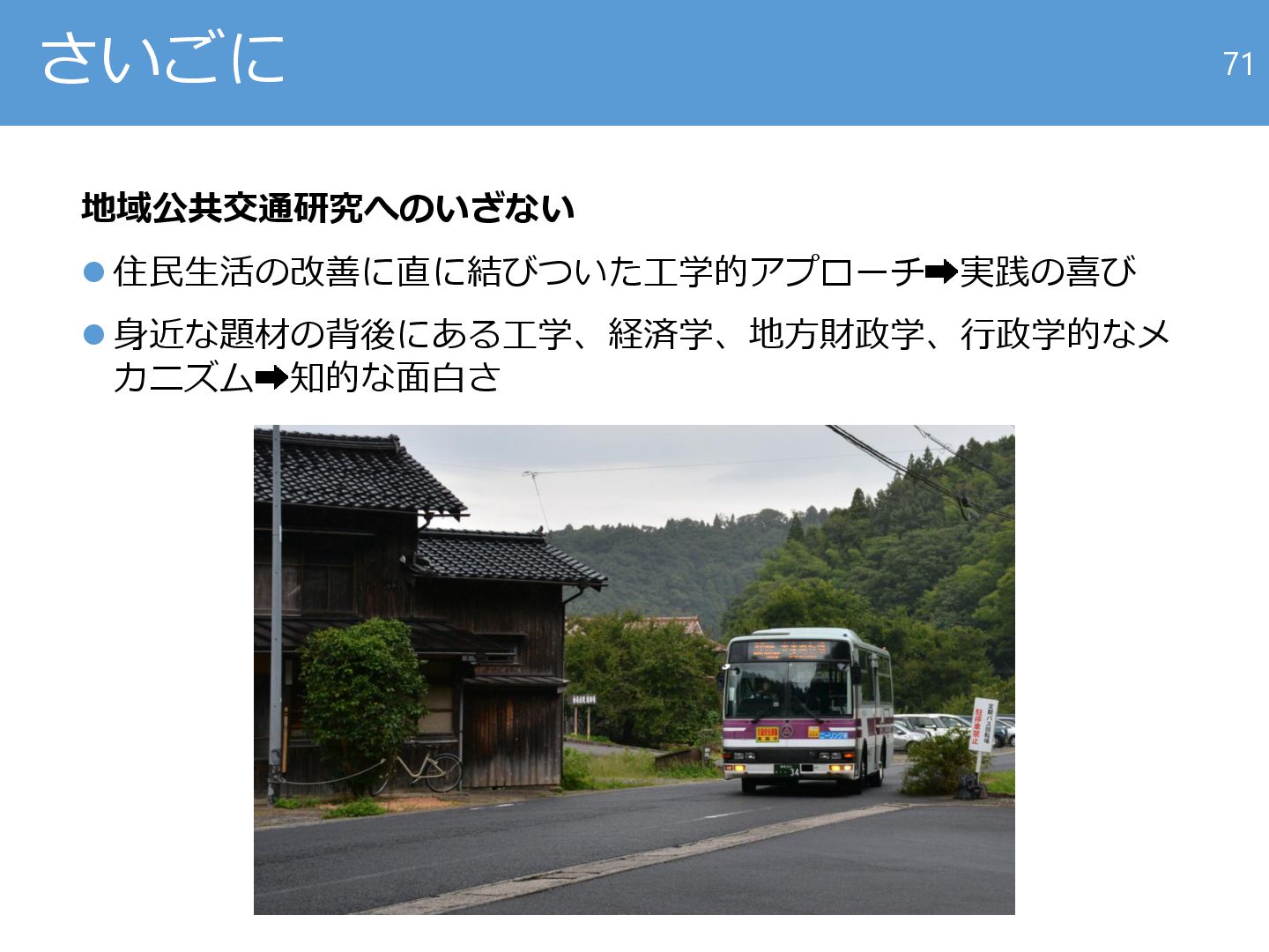 藤原章正, 杉恵頼寧:過疎地域における公共交通サービスの評価指標の提案,都市計画論文集,38.3巻,pp.475-480,2003. ⚫ 秋山哲男,吉田樹:生活支援の地域公共交通――路線バス・コミュニティバス・STサービス・デマンド型交通,学芸出版社,2009. ⚫ 加藤博和:地域公共交通の現場で何が求められているのか?,家田仁・小嶋光信:地域モビリティの再構築,pp.80-109,薫風社, 2021. ⚫ 中村嘉明, 溝上章志:バスロケーションシステムの導入・運用の実態と課題,土木学会論文集D3,74巻5号,pp. I_1197-I_1205,2018. ⚫ 土木学会:バスサービスハンドブック,2006. ⚫ 喜多秀行,谷本圭志:“地域公共交通計画の新たな潮流”特集にあたって,土木学会論文集D,65巻4号,pp.519-520,2009. ⚫ 喜多秀行:社会資本としての地域公共交通,運輸政策研究,運輸政策研究所設立15周年記念号,2010. ⚫ 家田仁・小嶋光信:地域モビリティの再構築,pp.80-109,薫風社, 2021. ⚫ 土木学会土木計画学研究委員会規制緩和後におけるバスサービスに関する研究小委員会:バスサービスハンドブック改訂版,2024. ⚫ 寺田一薫編著:地方分権とバス交通 規制緩和後のバス市場,勁草書房,2005. ⚫ 青木亮編著:地方公共交通の維持と活性化,成山堂書店,2020. ⚫ 宇都宮浄人:地域公共交通の統合的政策,東洋経済新報社,2021. ⚫ 宿利正史,軸丸真二:地域公共交通政策論第2版,東京大学出版会,2024. ⚫ 中村文彦:まちづくりにかかせない公共交通のために,新都市,75巻2号,pp.3-4,2021. ⚫ 小池淳司:権利と効率のストック効果に基づく社会的意思決定方法と実用的なストック効果計測手法の開発R4年度(1年目)の検討成果,社会資本整備審議会道路分科 会第23回事業評価部会 配布資料6,2023. ⚫ 猪井博登, 新田保次, 中村陽子:Capability Approachを考慮したコミュニティバスの効果評価に関する研究,土木計画学・論文集,21巻,pp.167-174,2004. ⚫ 谷本圭志:高齢社会のフロンティアで考える交通基本法-移動権への期待と不安-,運輸政策研究,13巻4号,pp.22-24,2011. ⚫ 国際交通安全学会:地域でつくる公共交通計画―日本版LTP策定のてびき,2012. ⚫ 何玏,楽奕平:バス産業規制緩和後の生活交通確保に対する学説と国・自治体の姿勢の展開―ミニマム保障と利便性向上の概念的曖昧さと政策目的の希薄化―,土木学 会論文集,80巻20号,2025. ⚫ 加藤博和,地域公共交通をプロデュースする-それは,ライフスタイルを提案すること,ていくおふ,149号,pp. 4-11,2018. ⚫ 加藤博和:地域公共交通が支える超高齢社会-地域コミュニティがモビリティを「つくり」「守り」「育てる」,都市計画,64巻4号,pp. 46-51,2015. ⚫ 加藤博和・高須賀大索・福本雅之:地域参画型公共交通サービス供給の成立可能性と持続可能性に関する実証分析-「生活バスよっかいち」を対象として-,土木学会 論文集D,65巻4号,pp. 568-582,2009. ⚫ 太田恒平:バスのサービスレベル向上と運賃策による熊本都市圏の渋滞緩和効果推計 ~公共交通への公的投資に向けた感度と集計QVに基づく迅速なシナリオ検討~, 土木計画学研究発表会・講演集第69巻,2024. ⚫ 西村和記, 東徹, 土井勉, 喜多秀行:クロスセクター効果で測る地域公共交通の定量的な価値,土木学会論文集D3,75巻5号,2019. ⚫ 酒井達朗:乗合バス事業者の個票データ分析に基づく地域公共交通事業への収支改善インセンティブ強化施策の検討,運輸政策研究,25巻,pp.6-17,2023. ⚫ 山本卓登:不採算バス路線に関する特別交付税措置の性質とその問題,運輸政策研究,25巻,pp.18-28,2023. ⚫ 何ロク,永田右京,楽奕平:地域公共交通のあるべき補助方式への―考察―赤字補填からの脱却の主張に着目して―,土木学会論文集,80巻9号,2024. ⚫ 喜多秀行,松永拓也,蘆田哲也,谷本圭志:リスク負担能力と経営改善努力を考慮した運行委託契約に関するモデル分析,交通工学研究発表会論文報告集,27巻, pp.141-144,2007. ⚫ 村野祐太郎, ZOU Wenqian, 溝上章志:需要変動を内生化した地域公共交通に対するインセンティブ補助の理論とその適用,土木学会論文集D,39巻5号,pp. I_649-I_658, 2013. ⚫ 山本卓登,何玏:市町村における地域公共交通政策の財源認識と運用の実態:市町村アンケートを基に,交通学研究,67号,pp.69-76,2024. 73