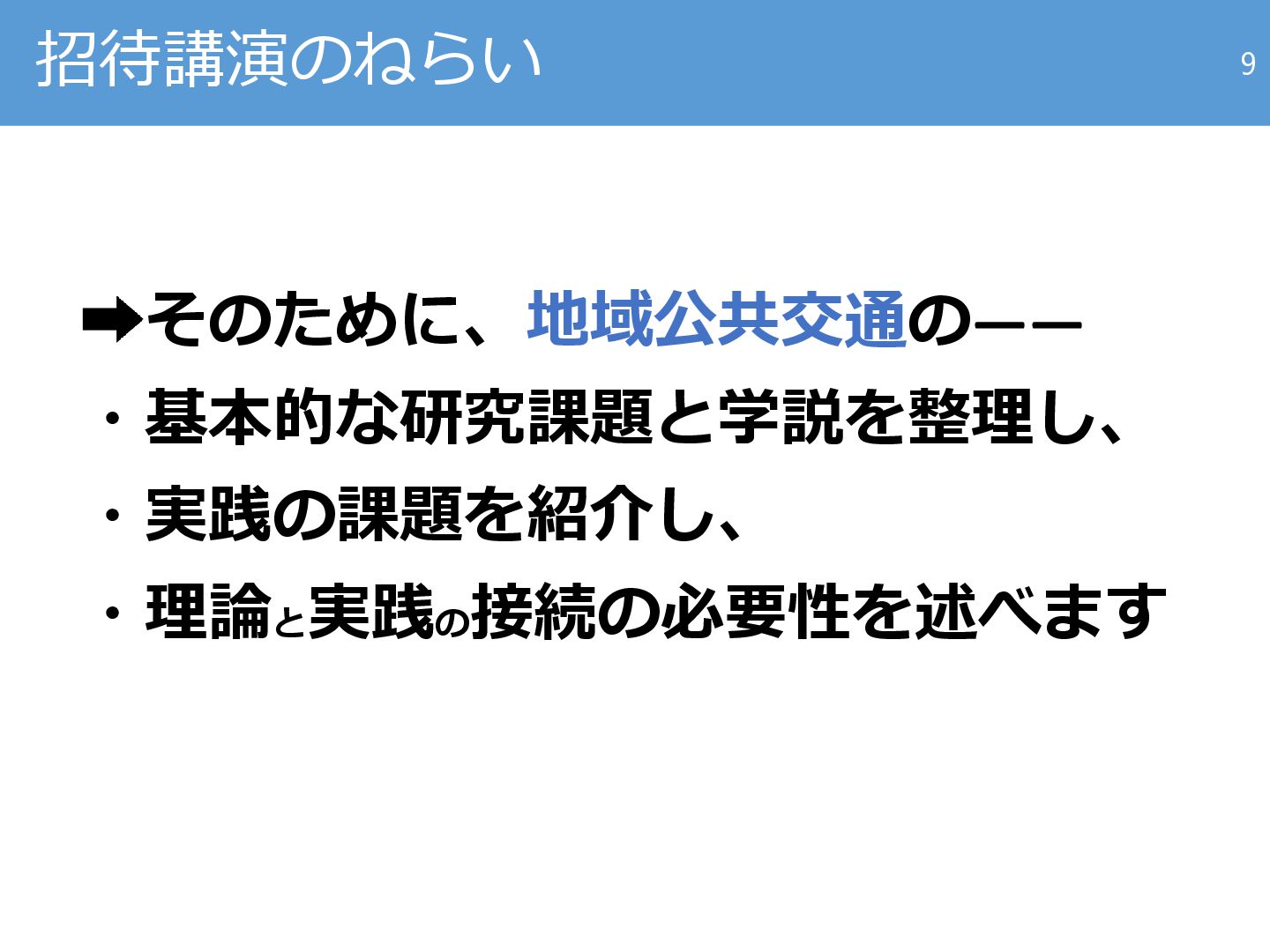8. 公共交通をとりまく研究・実践の全体像 政策領域 生活支援交通【権利】 都市公共交通【効率】 交通計画 喜多らのグループ等が精力 的に研究開発を続けてきた (逆に、ハードの道路イン フラへのフィードバックは ない)