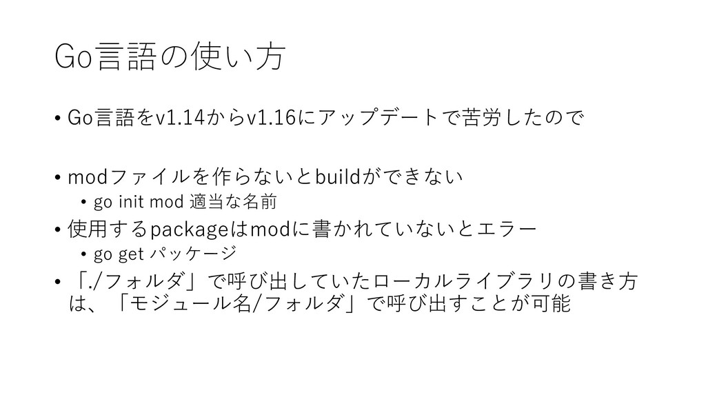 • 使用するpackageはmodに書かれていないとエラー • go get パッケージ • 「./フォルダ」で呼び出していたローカルライブラリの書き方 は、「モジュール名/フォルダ」で呼び出すことが可能