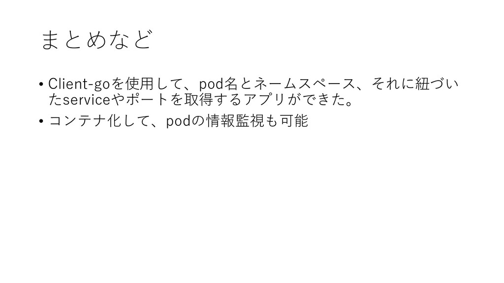 まとめなど • Client-goを使用して、pod名とネームスペース、それに紐づい たserviceやポートを取得するアプリができた。 • コンテナ化して、podの情報監視も可能