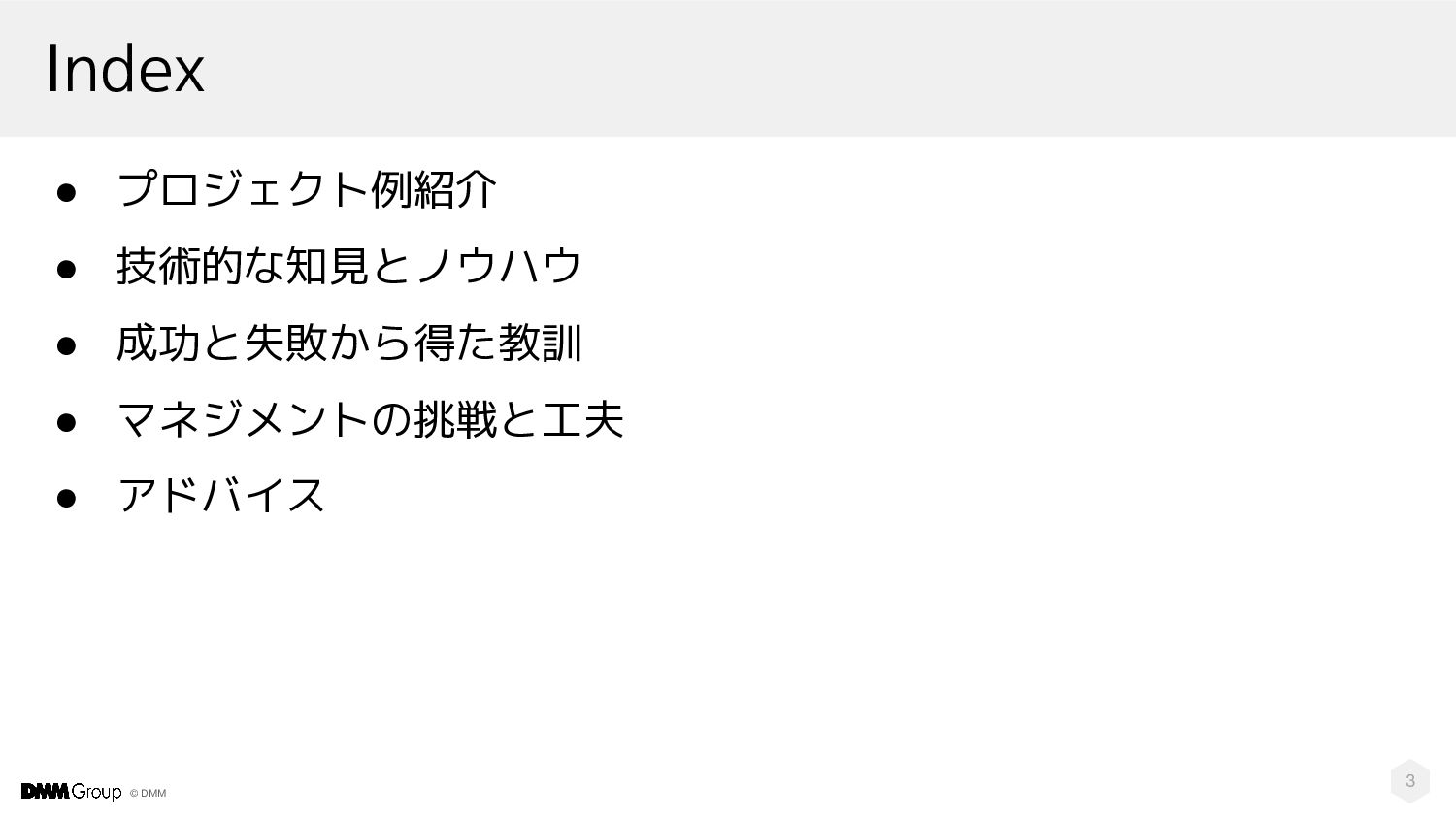 © DMM Index • プロジェクト例紹介 • 技術的な知見とノウハウ • 成功と失敗から得た教訓 •