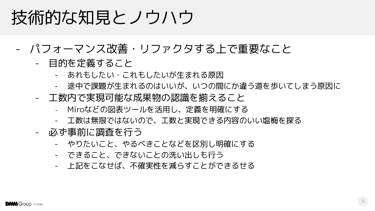 途中で課題が生まれるのはいいが、いつの間にか違う道を歩いてしまう原因に - 工数内で実現可能な成果物の認識を揃えること - Miroなどの図表ツールを活用し、定義を明確にする - 工数は無限ではないので、工数と実現できる内容のいい塩梅を探る - 必ず事前に調査を行う - やりたいこと、やるべきことなどを区別し明確にする - できること、できないことの洗い出しも行う - 上記をこなせば、不確実性を減らすことができるせる 5