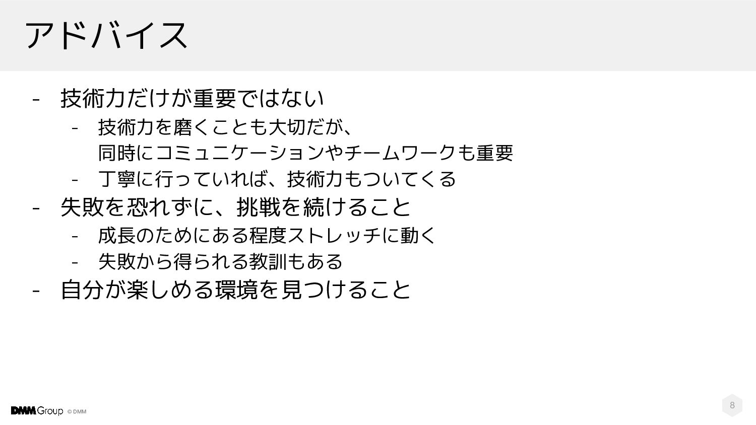 - 失敗を恐れずに、挑戦を続けること - 成長のためにある程度ストレッチに動く - 失敗から得られる教訓もある - 自分が楽しめる環境を見つけること 8